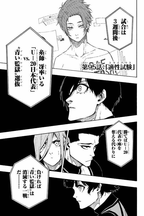 二次選考を勝ち抜き、出揃ったストライカーは35名!! ”青い監獄(ブルーロック)”の存続を懸け、総力で挑むはUー20日本代表との決戦試合!! ”青い監獄”レギュラーとして出場する11人を選ぶ、『適性試験』が幕を開ける!! TOP6 FWを超え、潔は自分を主張できるか!?