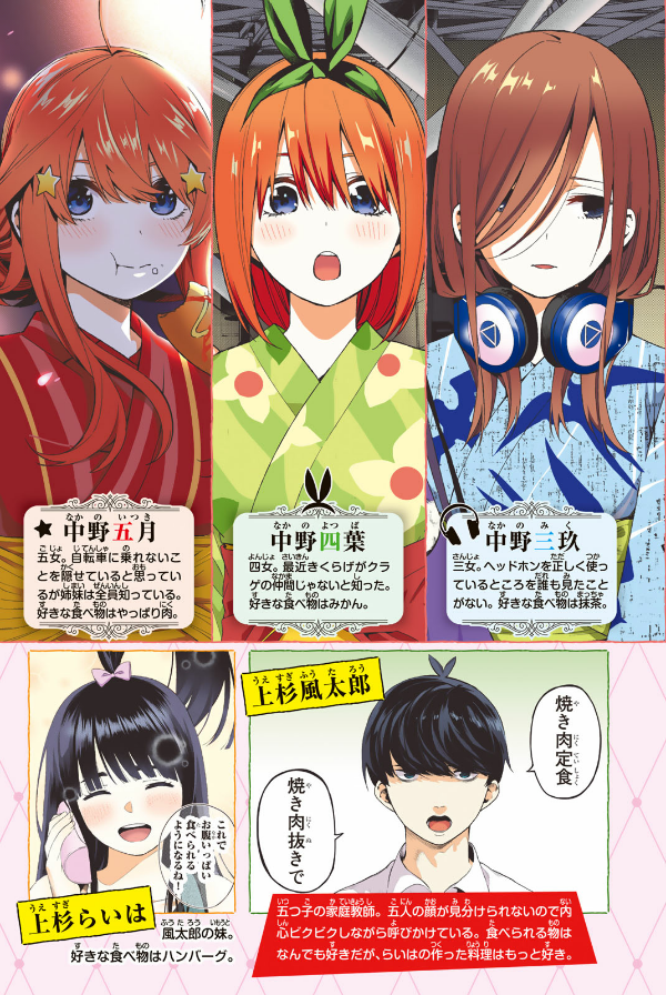 「落第寸前」「勉強嫌い」の美少女五つ子を、アルバイト家庭教師として「卒業」まで導くことになった風太郎。勉強を頑張った五つ子たちと共に行った花火大会では姉妹たちの願いを叶えることに成功し、少しずつお互いの信頼が深まってきたことを実感。だがその矢先、中間試験目前に五つ子たちの父親から「五つ子たちの赤点=即クビ」という条件を告げられる。風太郎は、中間試験を五つ子たちと共に突破できるか──!! あなたは誰推し? かわいさ500%の五つ子ラブコメ、フルカラー版第3巻!!