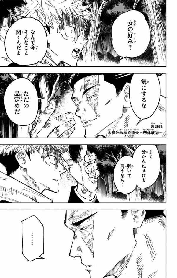 京都姉妹校交流会が始まった。一日目の団体戦は区画内の2級呪霊を先に祓った側の勝利となるのだが、好戦的な東堂は東京側を即襲撃、虎杖が迎え撃つ形に。だが虎杖暗殺の為、他の京都組も参戦し、虎杖は窮地に!!