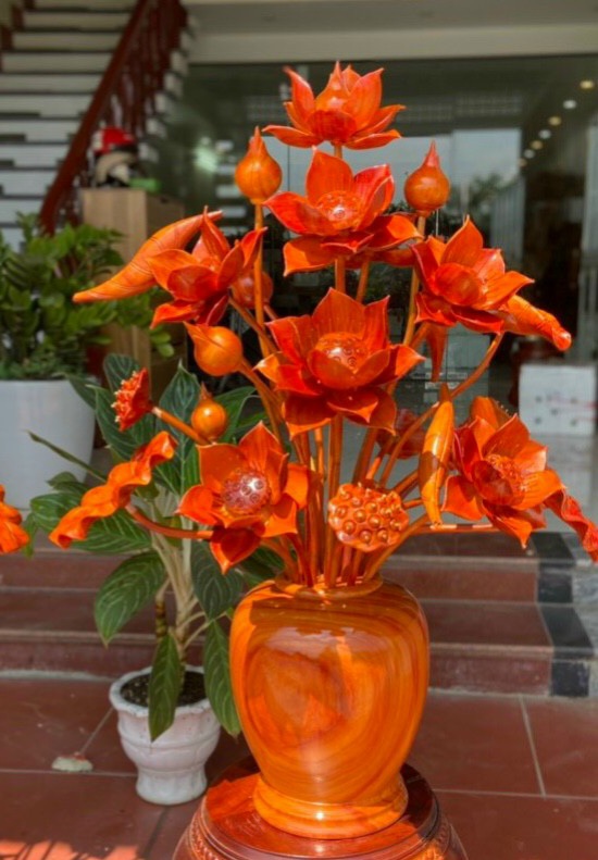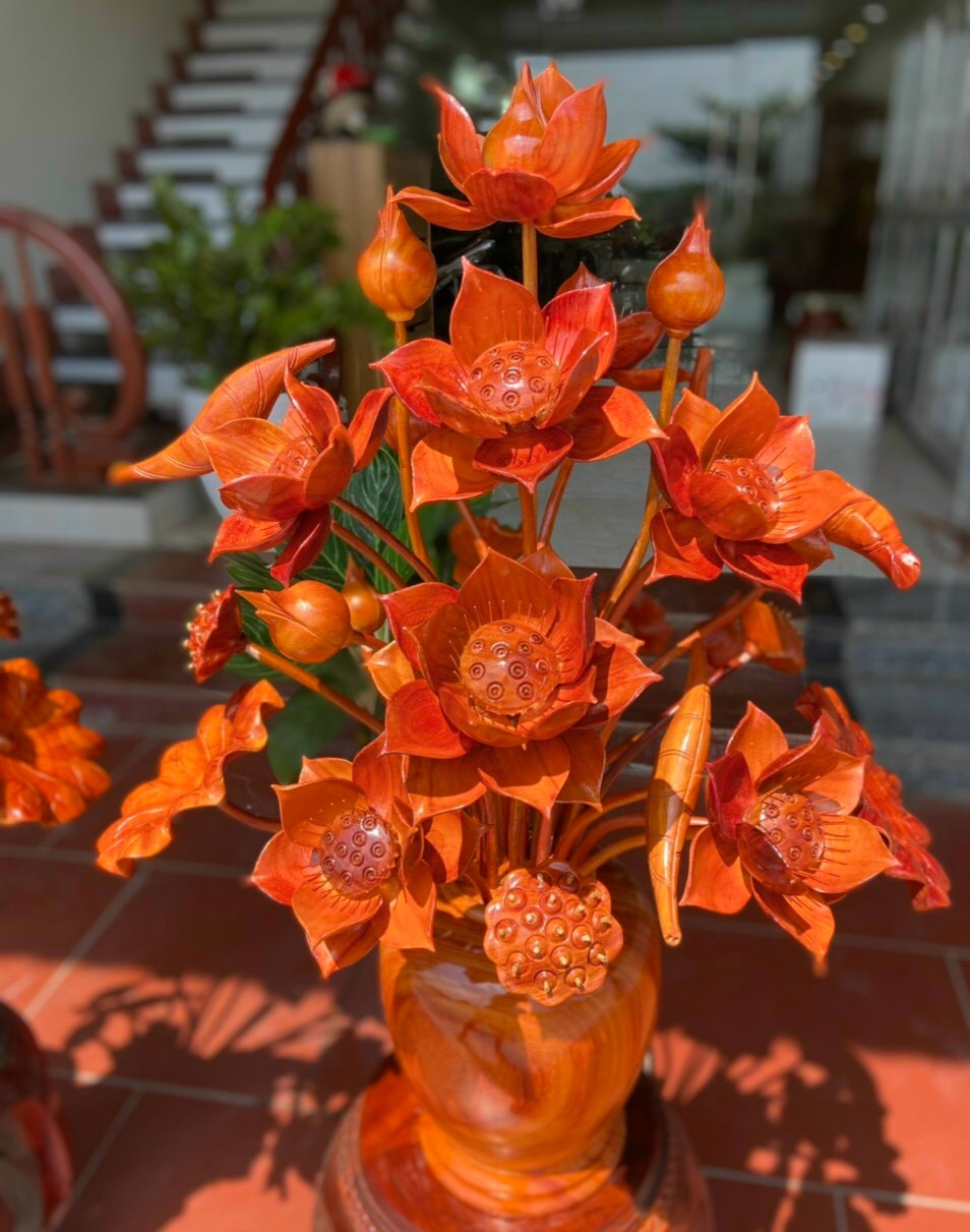 Bình hoa sen trang trí phòng khách ,phòng thờ được làm bằng chất liệu gỗ hương đỏ tự nhiên 100%  Kt bình cắm 30×25cm ,kt cao tổng kể cả  hoa lá gương 92cm ,xòe rộng 70cm  _ Bình hoa sen được tiện phân khúc từ đầu miệng ,xuống chân đế với độ mền mại với độ chính xác cao .Kết hợp với khắc tỉa hoa lá cành ,tỉ mỉ tinh sảo kỳ công .Đi hầu hết tất mọi tri tiết của bình hoa sen ,Được gọt tỉa chỉnh sửa ,kênh bong sắc nét hoàn toàn bằng tay thủ công .Đồng thời bình hoa sen được kiểm định kỹ lưỡng khắt khe ,như cho vào thẩm sấy cho gỗ khô kiệt .Mục đích trống dập nứt vênh mo mối mọt .Kết hợp với trà nhám ,đánh giấy giáp nhiều nước sờ mát lạnh song cho vào phun lót làm bóng mờ ,để giữ lại mầu sắc vân gỗ tự nhiên .Bình hoa sen được làm và hoàn thiện do bàn tay khối óc tài hoa .Từ những người thợ dầy rặn kinh nghiệm ,Cũng như tay nghề cao trong làng nghề truyền thống .Chính vì thế bình hoa sen bằng gỗ hương đỏ đã đáp ứng đầy đủ mọi tiêu trí cần thiết như ( Đẹp bền rẻ ) Thẩm mỹ nghệ thuật với chất lượng tuyệt vời