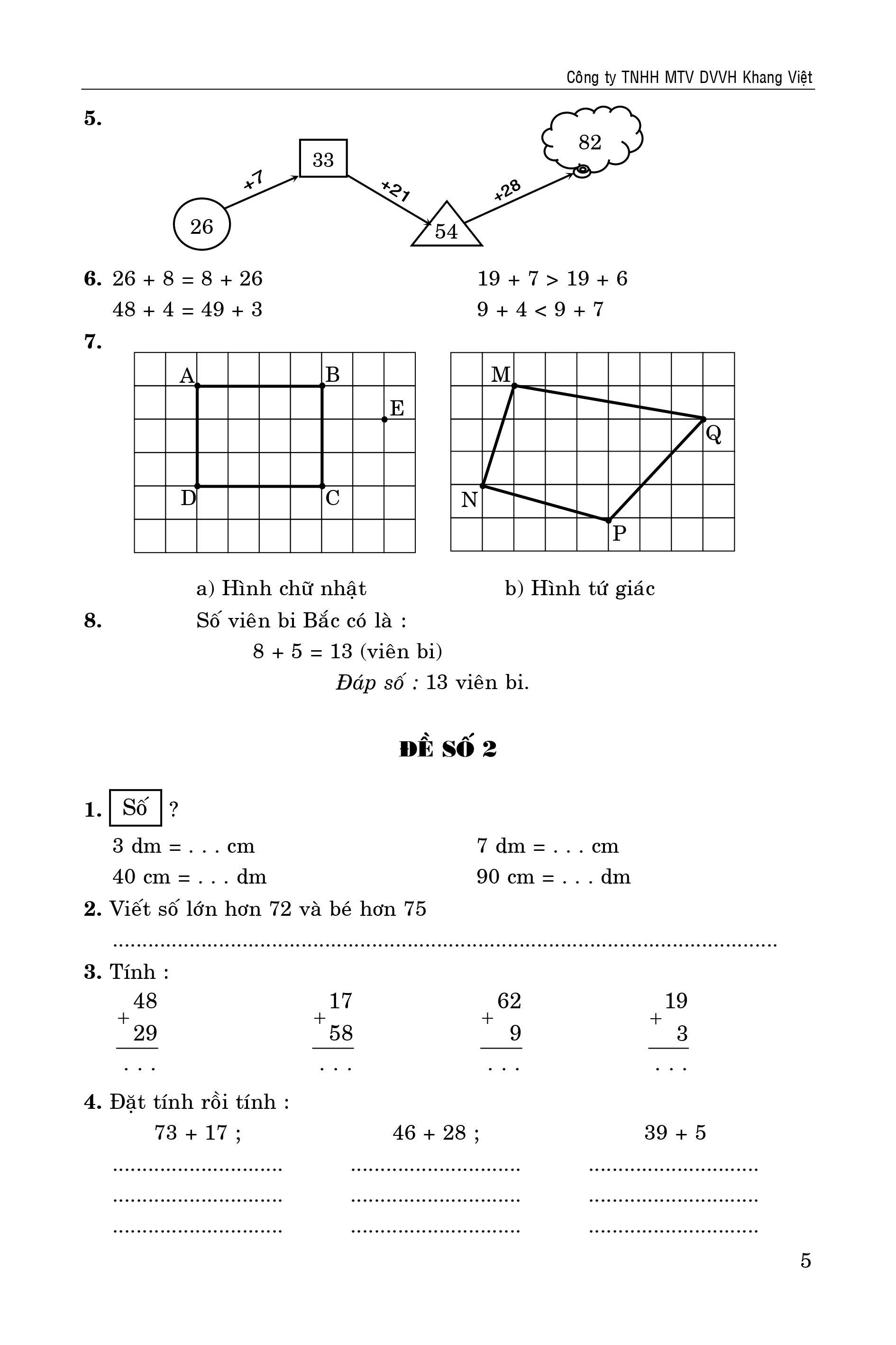 Mỗi đề có các dạnh bài tập cụ thể như: tính nhẩm, khoanh vào chữ đặt trước kết quả đúng, tính, đặt tính rồi tí