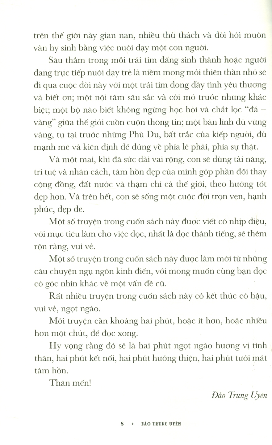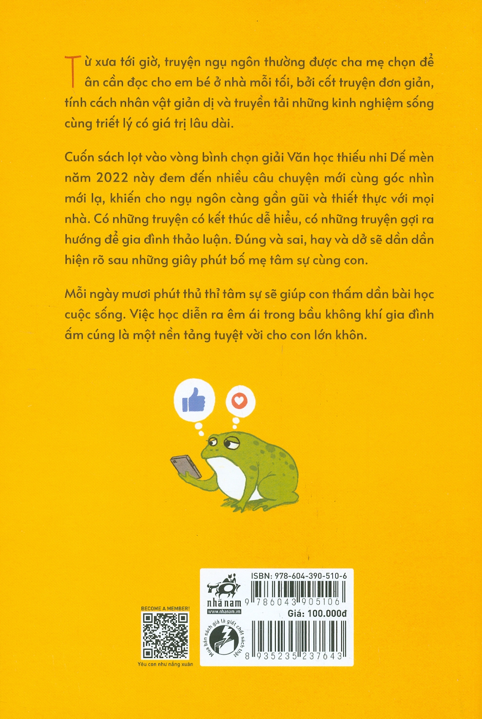 Cuốn sách lọt vào vòng bình chọn giải Văn học thiếu nhi Dế mèn năm 2022 này đem đến nhiều câu chuyện mới cùng góc nhìn mới lạ, khiến cho ngụ ngôn ngày càng gần gũi và thiết thực với mọi nhà. Có những truyện có kết thúc dễ hiểu, có những truyện gợi ra hướng để gia đình thảo luận. Đúng và sai, hay và dở sẽ dần dần hiện rõ sau nhưng giây phút bố mẹ tâm sự cùng con.