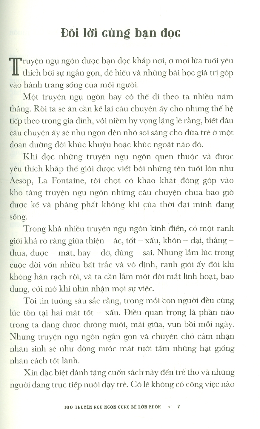 Từ xưa tới giờ, truyện ngụ ngôn thường được cha mẹ chọn để ân cần đọc cho em bé ở nhà mỗi tối, bởi cốt truyện đơn giản, tính cách nhân vật giản dị và truyền tải những kinh nghiệm sống cùng triết lý có giá trị lâu dài.