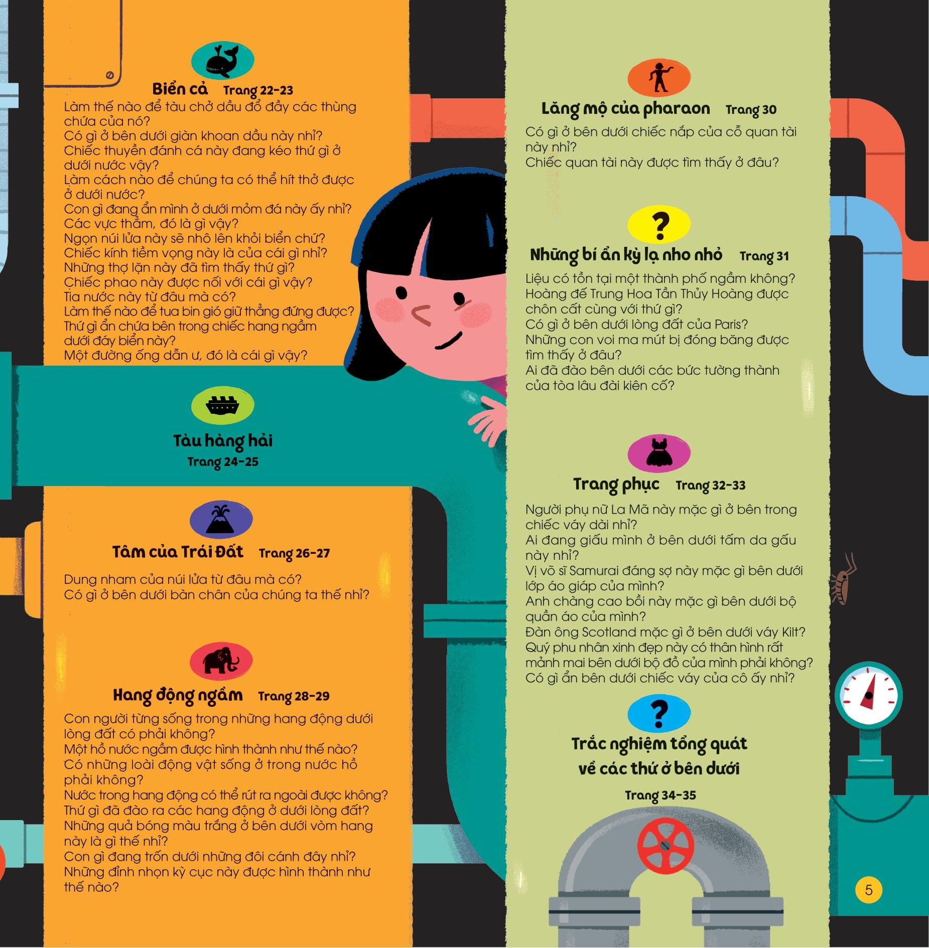 Cuốn sách bìa cứng cực đẹp, dày tới 36 trang, tổng hợp 16 chủ điểm hấp dẫn như: thành phố, đường cao tốc, vườn rau, hang động ngầm, lăng mộ, trang phục… sẽ đưa trẻ khám phá thế giới kiến thức vô cùng đa dạng và phong phú.