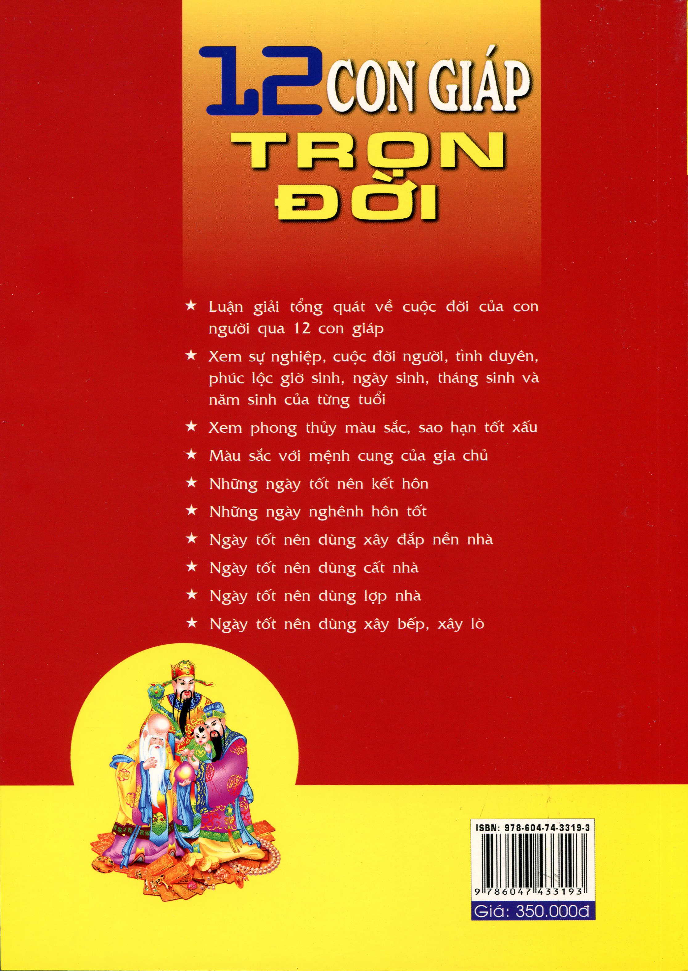 Sách 12 Con Giáp Trọn Đời luận giải tổng quát về cuộc đời của con người qua 12 con giáp. Chẳng hạn như những người tuổi Tý hay tuổi Sửu thì mang mạng gì, cung gì, cuộc sống lúc nhỏ như thế nào, hoặc người tuổi Hợi hay tuổi Dần thì tình duyên có suôn sẻ không, công việc làm ăn khi nào thì tiến triển, họp màu gì, v.v…