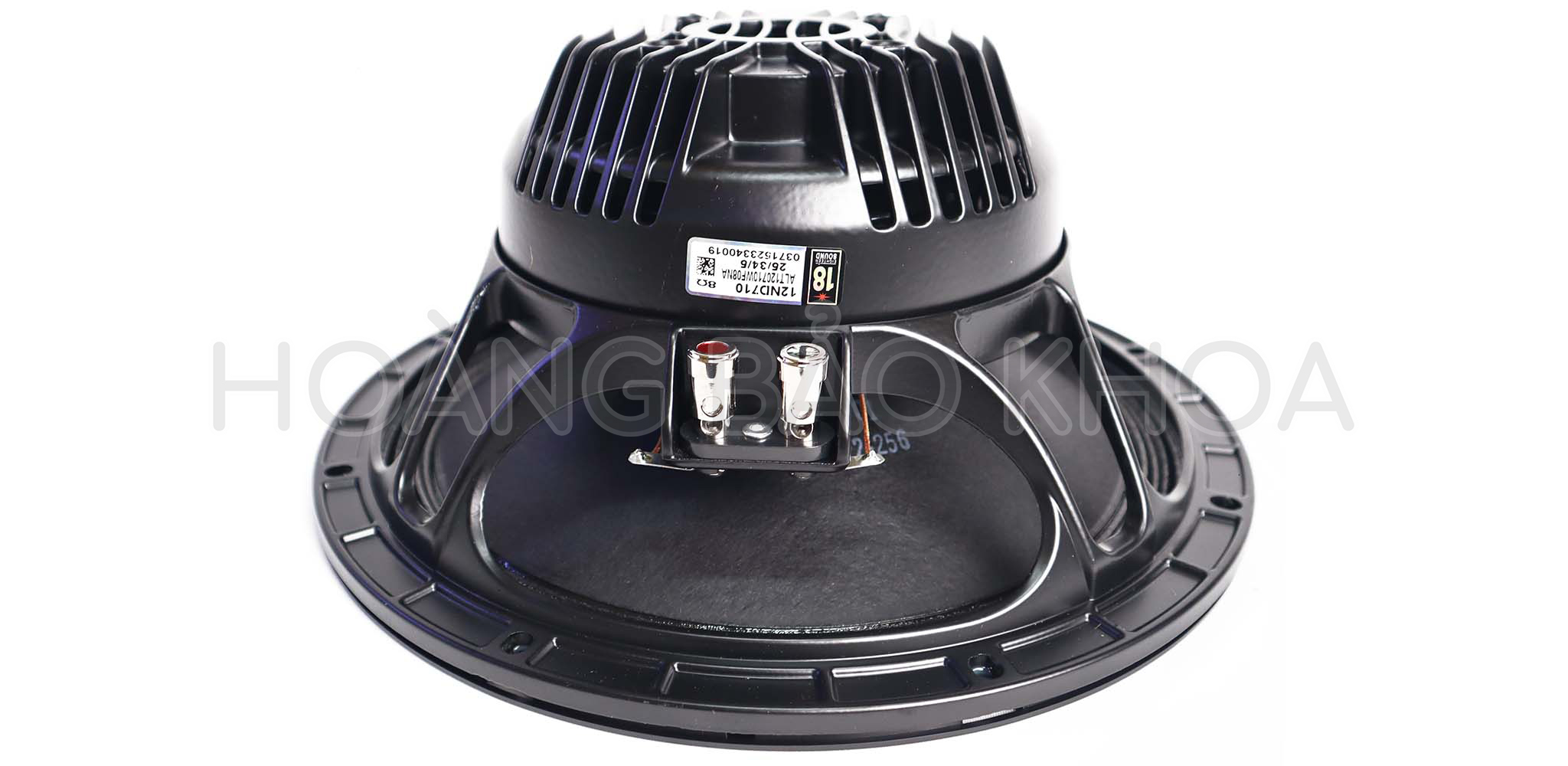 Xuất xứ: Ý  Độ nhạy trung bình 101 dB SPL 1W / 1m.  75 mm (3 in) Interleaved Sandwich Voice coil (ISV).  Công suất 450W.  Công suất liên tục 700W.  Nam châm từ Neodymium.  Công nghệ Double Silicon Spider (DDR) để giảm độ méo và giảm điện cảm.  Nón loa chống ẩm.  Thích hợp để tái tạo tần số trung bình. 12ND710 đã được thiết kế đặc biệt để sử dụng như một  midbass trong các thùng phản xạ 2 chiều nhỏ gọn hoặc như một củ tầm trung chuyên dụng hoặc được tải trực tiếp bằng còi, trong các hệ thống hòa nhạc và đấu trường lắp đặt cố định và lưu diễn đa chiều. Cụm nam châm neodymium đảm bảo nồng độ từ thông cao, nén công suất thấp và trao đổi nhiệt tuyệt vời vì cấu hình nam châm bên ngoài hiệu quả hơn đáng kể so với cấu trúc liên kết nam châm dưới cực truyền thống. Do đó, đã đạt được mức độ cao của hệ số lực và khả năng xử lý công suất với tỷ lệ công suất trên trọng lượng tối ưu. Khớp nối trực tiếp của giỏ thiết kế đặc biệt và cụm từ với bộ tản nhiệt lớn tạo điều kiện thuận lợi cho dòng nhiệt truyền qua không khí xung quanh, tăng khả năng xử lý điện năng và giảm độ nén công suất. Nón giấy cong đã được tạo ra bằng một loại bột gỗ có độ bền cao đặc biệt được thiết kế để đạt được độ tuyến tính tốt nhất có thể trong dải tần số dự định của nó và để kiểm soát cộng hưởng chế độ chuông xung quanh chu vi nón loa. Nón được vận chuyển bởi một hệ thống treo nhiều cuộn được hình thành từ một vật liệu giống như vải lanh. Chất lượng âm thanh và độ méo tiếng được cải thiện hơn nữa nhờ sử dụng công nghệ Double Demodulation Rings (DDR) được thiết kế để giảm đáng kể sự biến dạng xuyên điều chế và sóng hài, đồng thời cải thiện phản ứng nhất thời. 12ND710 thực hiện công nghệ cuộn dây Interleaved Sandwich Voice (ISV), trong đó một cuộn dây nhôm được quấn bên trong và bên ngoài một loại sợi thủy tinh có độ bền cao, mang lại hiệu suất nhiệt và cơ học tốt hơn so với các cuộn dây thông thường. Phương pháp xử lý nón loa chặn độ ẩm độc quyền giúp  phù hợp để sử dụng ngoài trời trong điều kiện thời tiết bất lợi. Ngoài ra, một lớp phủ đặc biệt được áp dụng cho cả mặt trên và mặt sau giúp 12ND710 có khả năng chống lại tác động ăn mòn của môi trường và quá trình oxy hóa cao hơn rất nhiều .