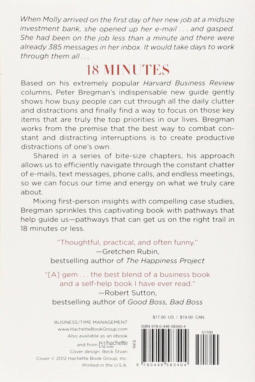 Based upon his weekly Harvard Business Review columns (which is one of the most popular columns on , receiving hundreds of thousands of unique page views a month), 18 MINUTES clearly shows how busy people can cut through all the daily clutter and distractions and find a way to focus on those key items which are truly the top priorities in our lives. Bregman works from the premise that the best way to combat constant and distracting interruptions is to create productive distractions of one's own. Based upon a series of short bite-sized chapters, his approach allows us to safely navigate through the constant chatter of emails, text messages, phone calls, and endless meetings that prevent us from focusing our time on those things that are truly important to us. Mixing first-person insights along with unique case studies, Bregman sprinkles his charming book with pathways which help guide us -- pathways that can get us on the right trail in 18 minutes or less.