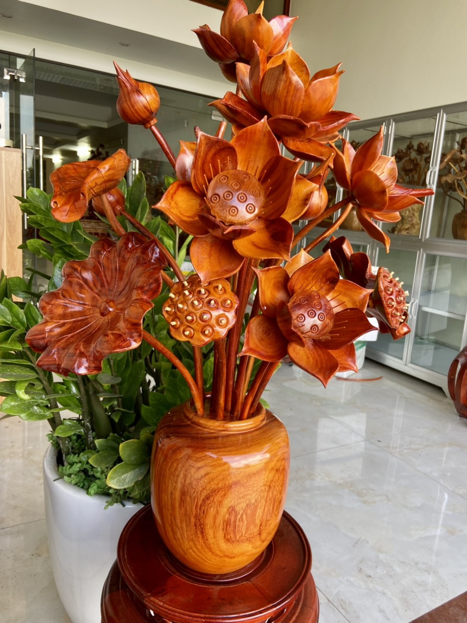 _ Bình hoa sen trang trí phòng khách ,phòng thờ được làm bằng chất liệu gỗ hương đỏ tự nhiên 100%  _ Kt bình cắm 30×25cm ,kt cao tổng kể cả  hoa lá gương 92cm
