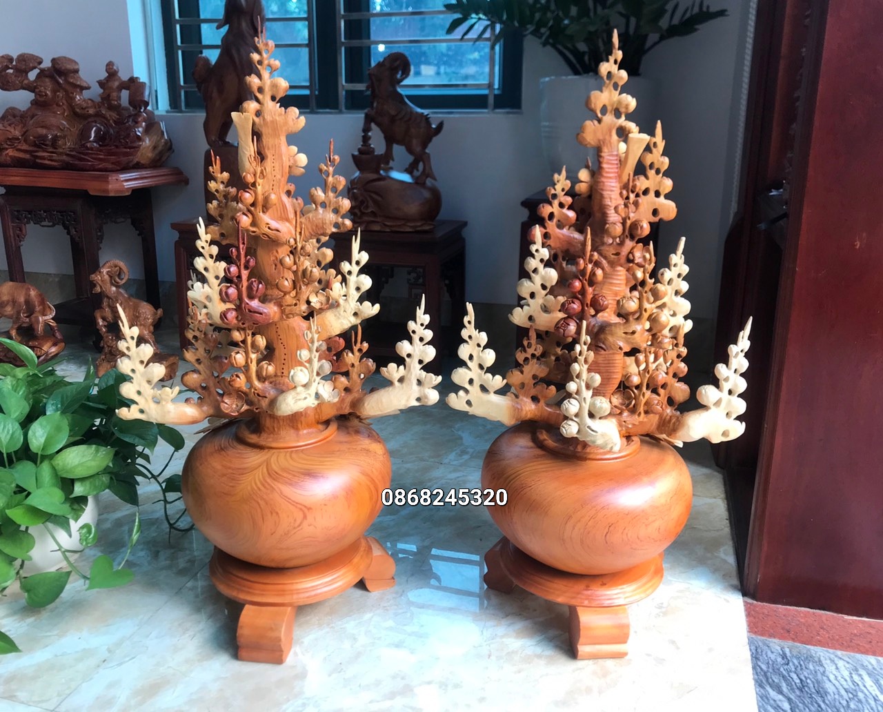 _ 2 bình hoa mai phú quý được làm bằng chất liệu gỗ hương tự nhiên 100% _ Kt tính cả kệ cao tổng 80×41×30cm _ 2 bình hoa mai được trạm khắc ,gọt tỉa