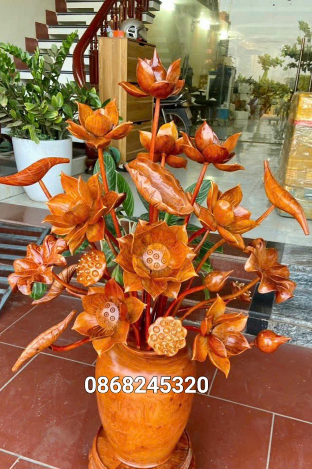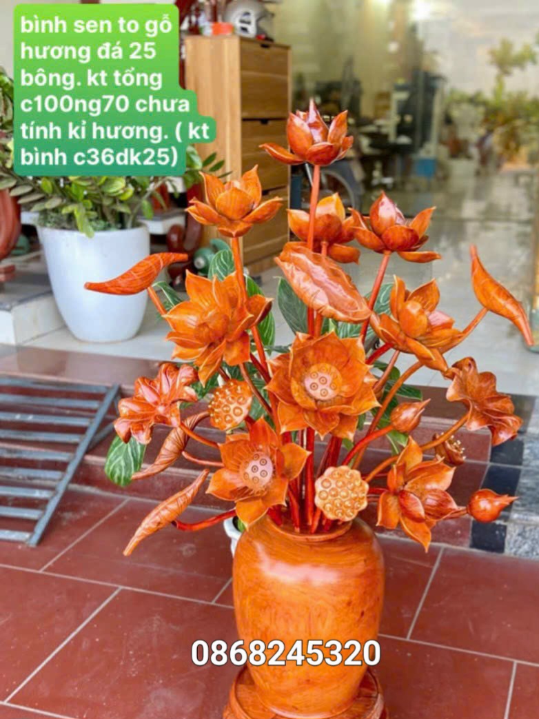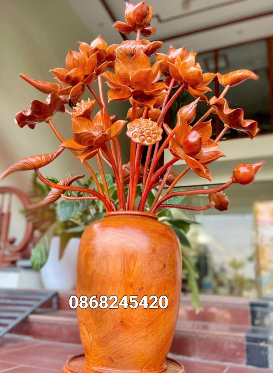 _ Bình hoa sen trang trí phòng khách ,phòng thờ được làm bằng chất liệu gỗ hương đỏ tự nhiên 100%  _ Kt bình cắm 30×25cm ,kt cao tổng kể cả  hoa lá gương 92cm