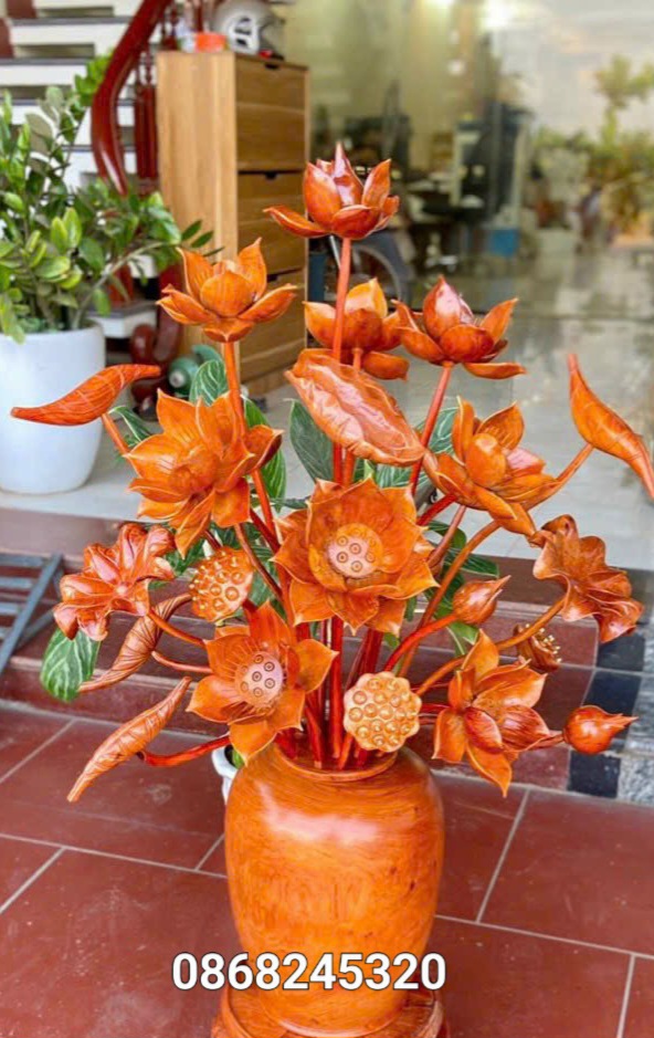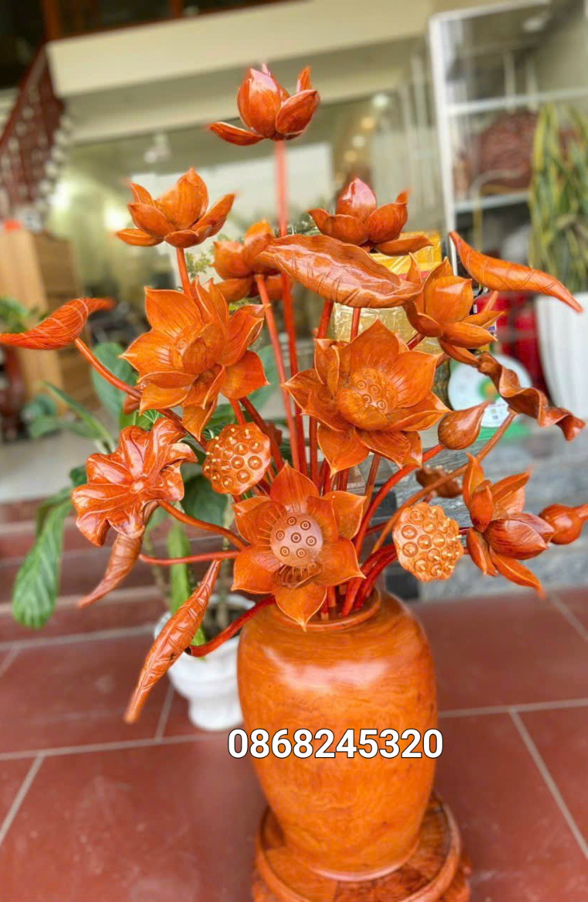 _ 1 bình hoa sen 21 cành trang trí ,phòng khách ,phòng thờ được làm bằng chất liệu gỗ hương đỏ tự nhiên 100% _ Kt bình cắm 23×22cm+ hoa lá gương cao tổng 85cm