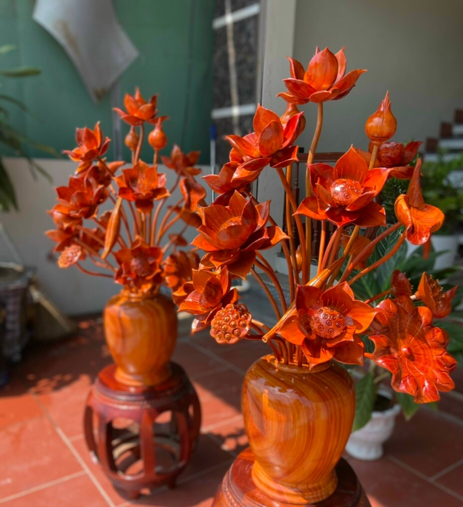 _ 2 Bình hoa sen trang trí phòng thờ phòng khách được làm bằng chất liệu bình cắm gỗ hương đỏ và hoa lá gương bằng gỗ ngọc am tự nhiên 100% _ Kích thước