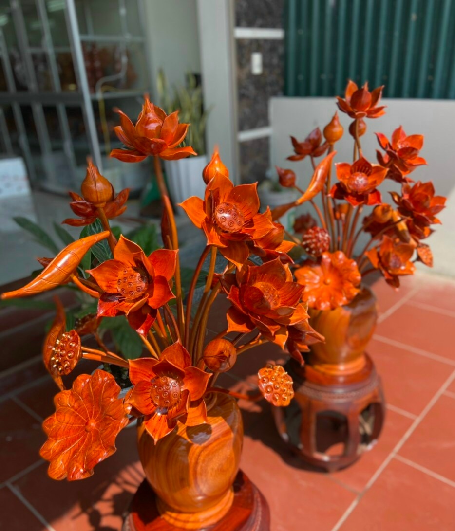 _ 2 bình hoa sen trang trí phòng thờ phòng khách ,được làm bằng chất liệu gỗ hương đỏ tự nhiên 100% _ Kt bình cắm 30×25cm + hoa lá gương cao tổng 92cm xòe