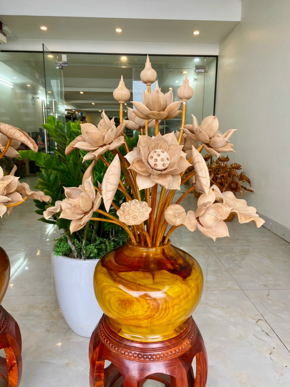_ Bình hoa sen trang trí phòng thờ phòng khách ,phòng khách được làm bằng chất liệu gỗ mun đuôi công tự nhiên 100% _ kt bình cắm hoa 23×37cm + kt 25 hoa lá