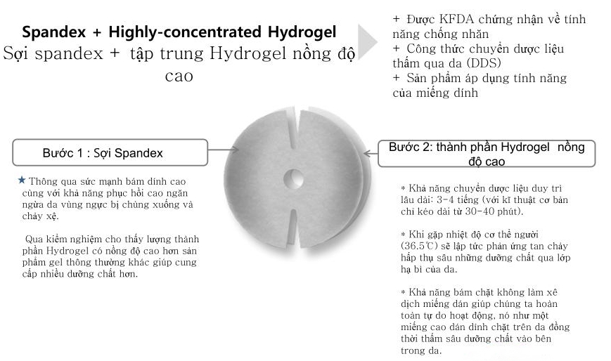 - Sự khác biệt trong việc sử dụng “sợi Spandex và thành phần Hydrogel nồng độ cao" giúp tăng khả năng bám dính & thẩm thấu tinh chất; tăng nhanh hiệu quả của sản phẩm.