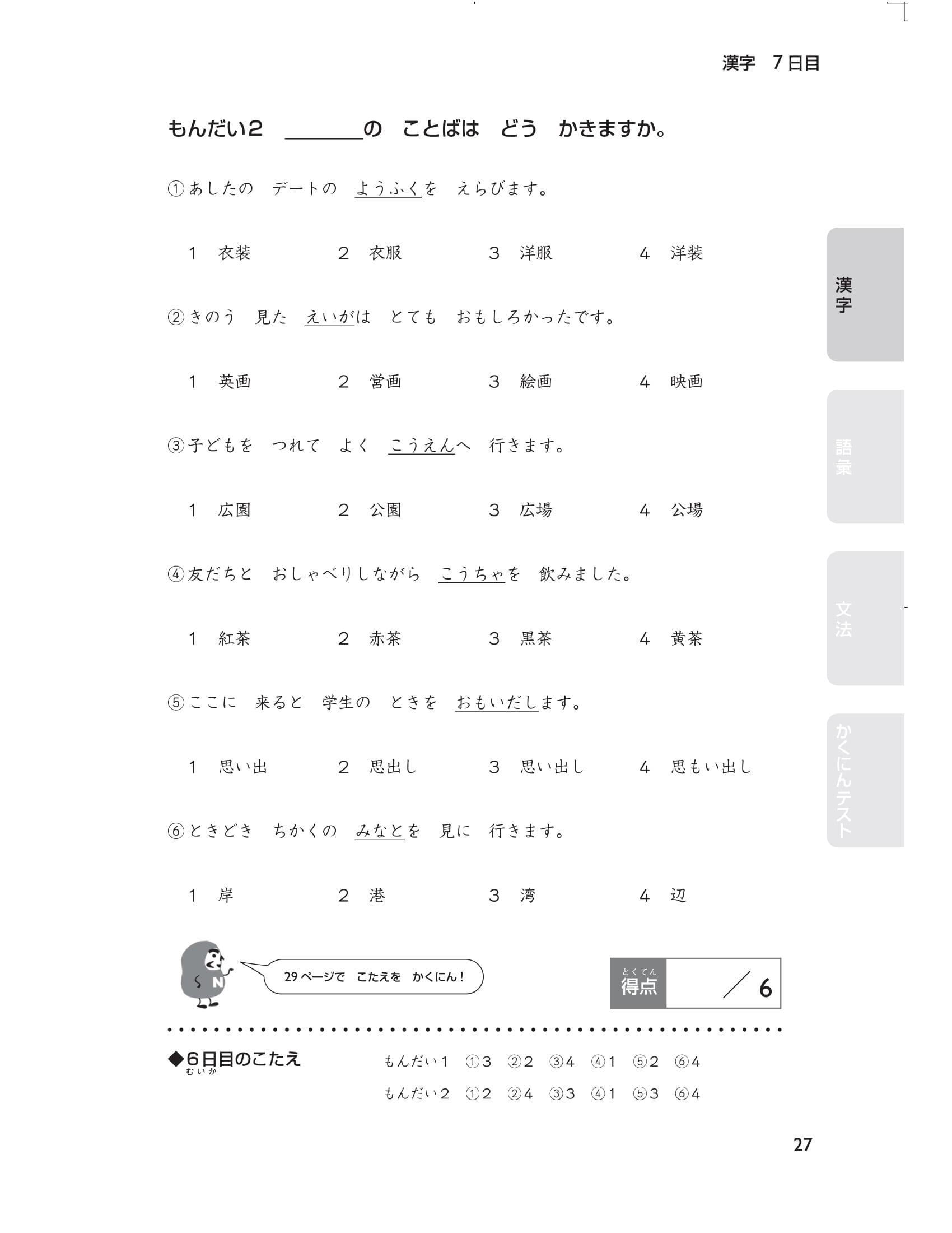 Cuối cùng, có 5 bài thi thử (tổng cộng 40 câu hỏi) mô phỏng đề thi năng lực tiếng Nhật. Thử thách bản thân ngay trước kỳ thi bằng cách xem lại nhiều lần những chỗ mình đã sai ( thứ tự các phần trong đề thi chính thức là chữ Hán, từ vựng và cuối cùng là ngữ pháp) bạn nhé. Hãy sử dụng cuốn sách này một cách hiệu quả Chúng tôi đã chuẩn bị rất nhiều câu hỏi để các bạn có thể luyện tập trong 15 ngày theo thứ tự các phần: chữ Hán, từ vựng, ngữ pháp. Hơn nữa, thông qua bảng checklist bạn có thể dễ dàng phân bổ số lượng câu hỏi nên làm trong một ngày và sắp xếp kế hoạch học tập cho đến thời điểm thi sao cho phù hợp.