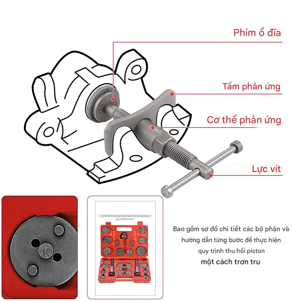 Công dụng: giúp cảo ép pít tông thắng đĩa về vị trí ban đầu. Hổ trợ đầy đủ các kết nối. FULL bộ 23 chi tiết như mô tả 100% Giá rẻ phù hợp với nhiều garage.