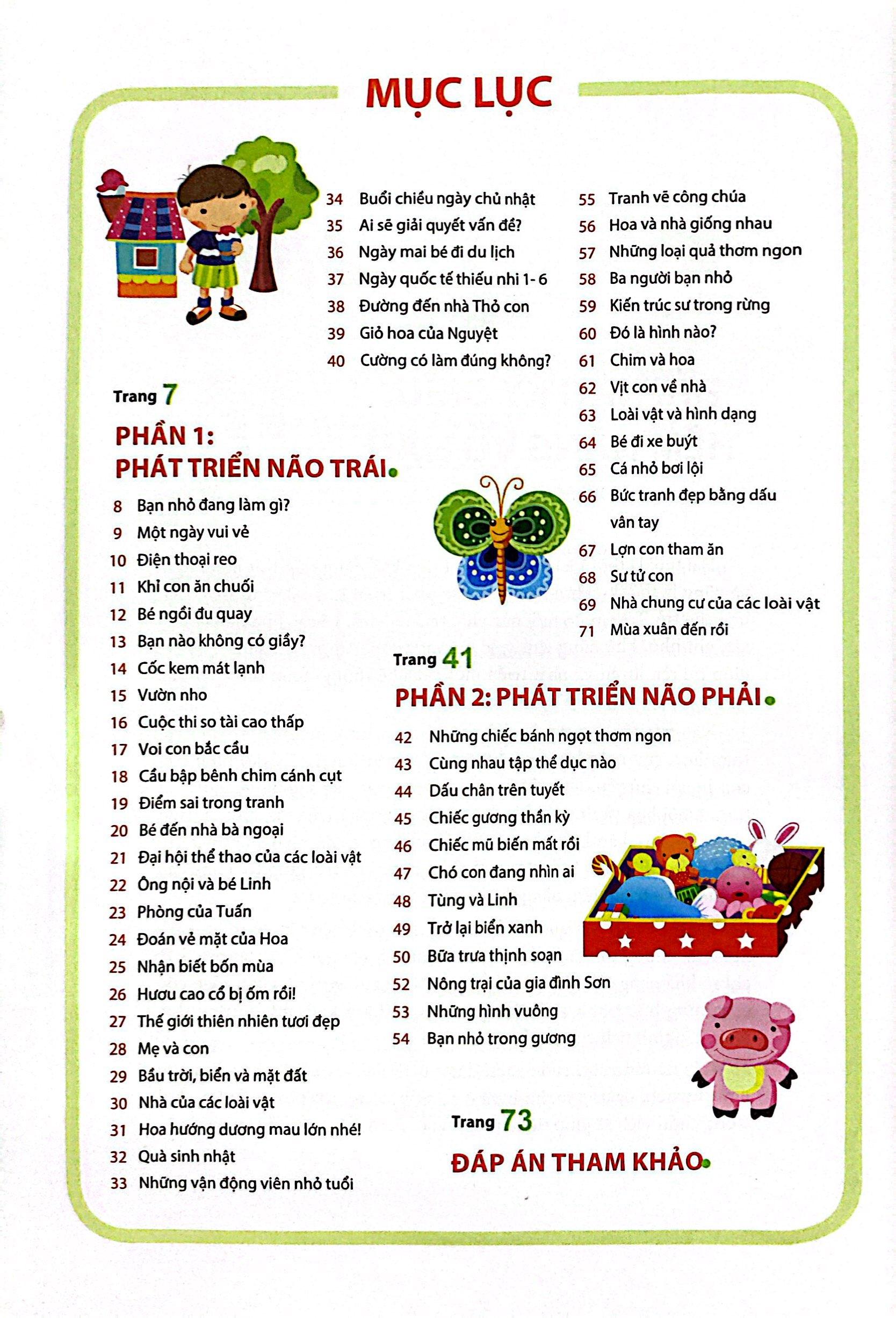 300 Trò Chơi Phát Triển Trí Tuệ Cho Trẻ 2 Tuổi (Tái Bản 2019) Dựa trên lí luận giáo dục khoa học trí não, bộ sách gồm những bài luyện tập tổng hợp để phát triển cân bằng giữa não trái và não phải cho trẻ. Chủ yếu nhằm nâng cao 5 khả năng: chú ý, quan sát, tưởng tượng, sáng tạo và ghi nhớ. Tùy theo đặc điểm phát triển trí tuệ và khả năng nhận biết của trẻ từ 2-6 tuổi, bộ sách được biên tập theo trình độ từ dễ đến khó, giúp trẻ mở ra cánh cửa trí tuệ qua những trò chơi thú vị, bổ ích, để trẻ thông minh, hiểu biết hơn. 2 tuổi – Hiểu ngôn ngữ, nhận biết các kiến thức đời sống, so sánh phân biệt, nhận biết hình dạng. 3 tuổi – Diễn đạt ngôn ngữ, nhận biết hình dạng, khả năng quan sát, khả năng tổng hợp. 4 tuổi – Sắp xếp, đếm số lượng, cảm nhận về không gian, khả năng ghi nhớ, phối hợp nhịp nhàng. 5 tuổi – Phân tích tổng hợp, thay đổi tư duy, phát huy khả năng tưởng tượng, khái quát. 6 tuổi – Phán đoán suy luận, phân tích tổng hợp, thay đổi tư duy, khả năng sáng tạo .