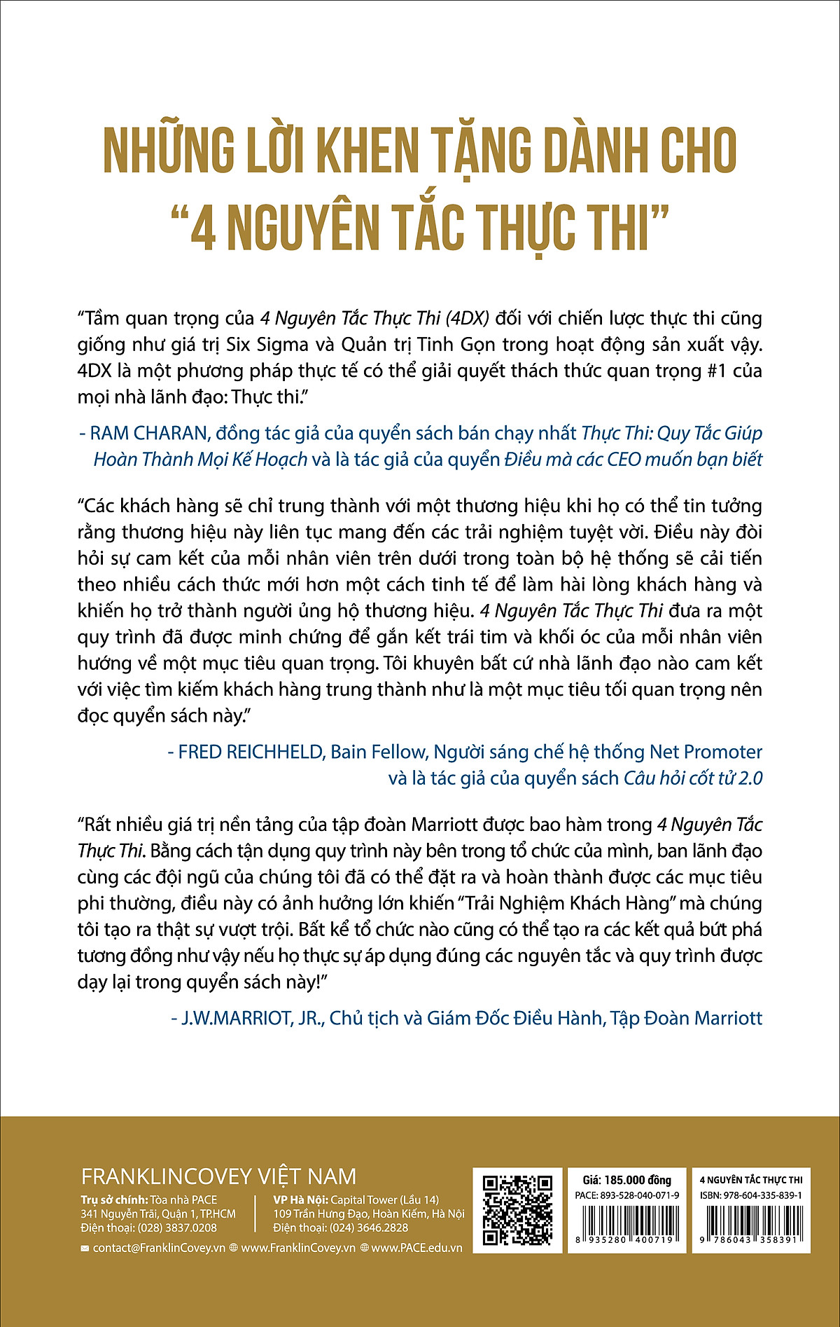 4 Nguyên Tắc Thực Thi (4DX) là một công thức đơn giản, có thể dùng nhiều lần và đã được minh chứng trong việc thực thi những ưu tiên chiến lược quan trọng nhất ngay giữa vòng xoáy của ‘cơn lốc’. Những nguyên tắc trong 4DX giúp mọi nhà lãnh đạo có khả năng vượt ra khỏi tầm nhìn của mình để thực thi chiến lược một cách hoàn hảo. Cuốn sách này là một món quà tuyệt vời cho bất kỳ nhà lãnh đạo ở bất kỳ tổ chức nào.