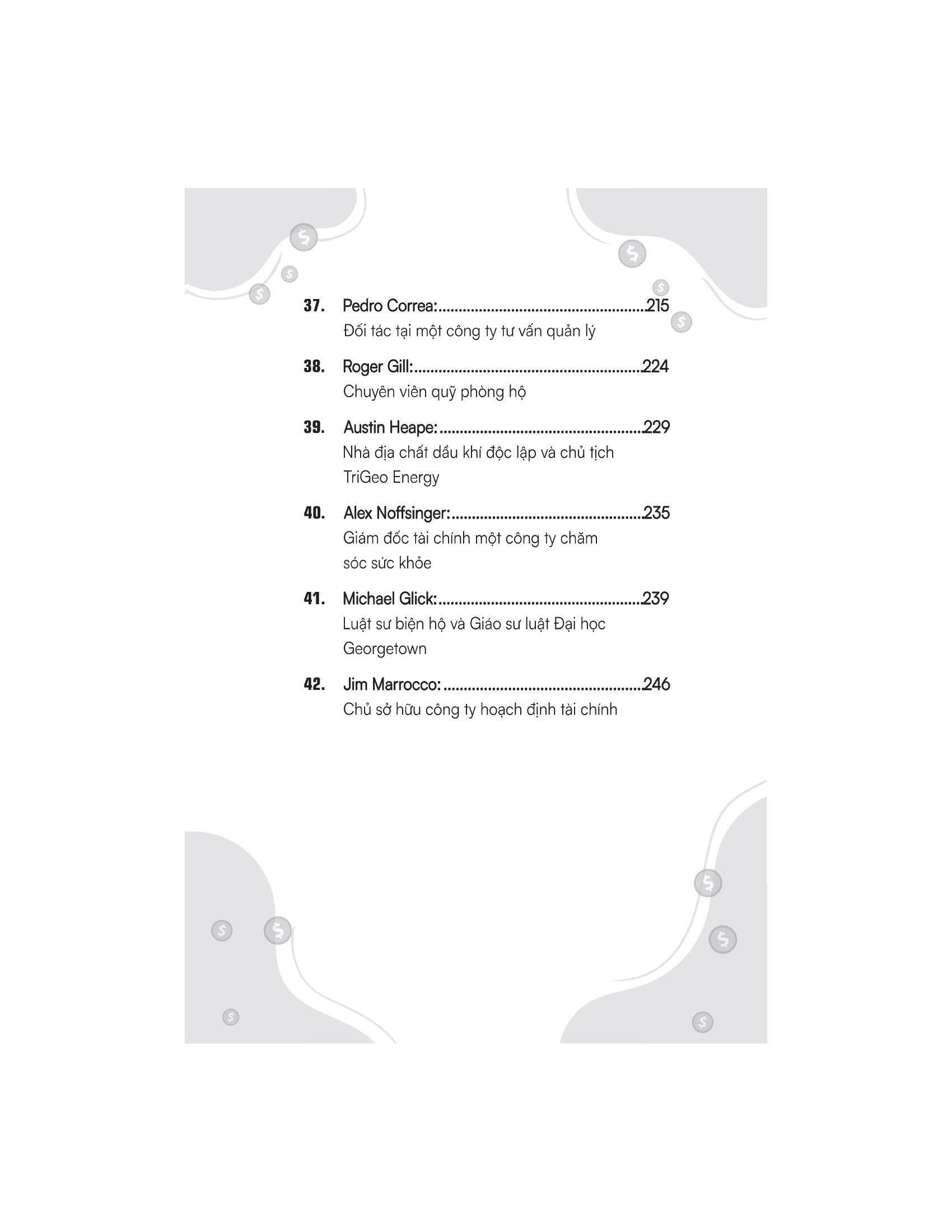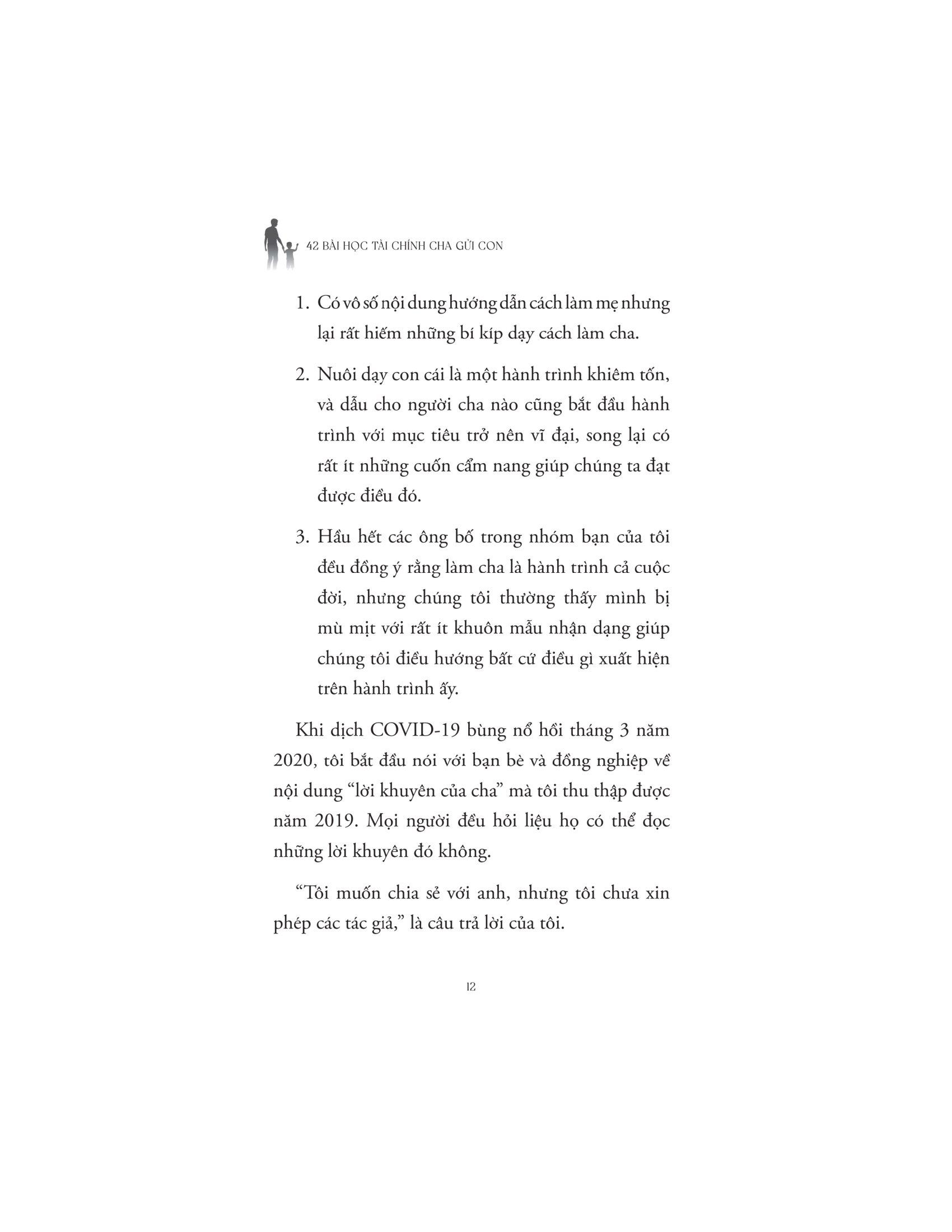 Cuốn sách “42 bài học tài chính cha gửi con” gồm những câu chuyện và lời khuyên ngoài đời thực được viết bởi 42 ông bố thuộc mọi tầng lớp xã hội – bao gồm: Các vận động viên chuyên nghiệp, nhân vật truyền hình, doanh nhân thành đạt, cựu quân nhân và những người bạn thân thiết khác của tác giả.
