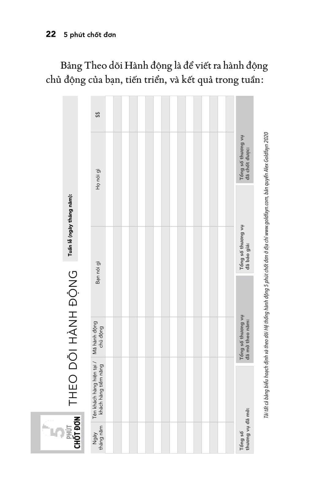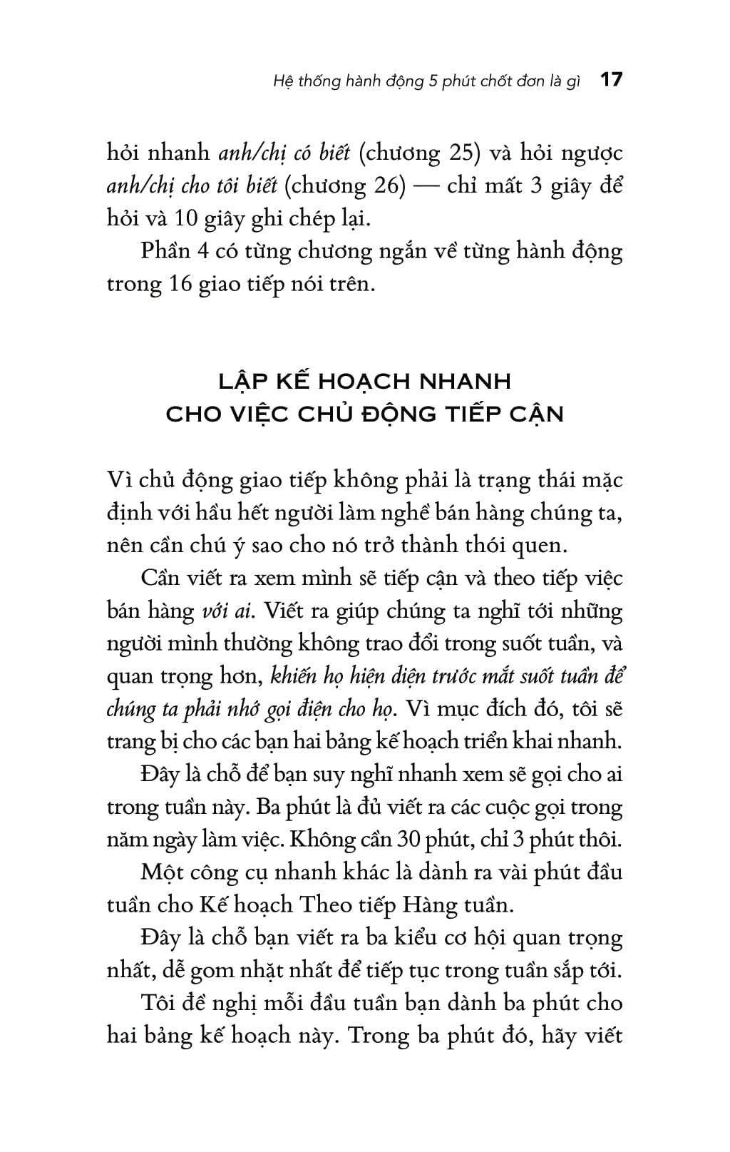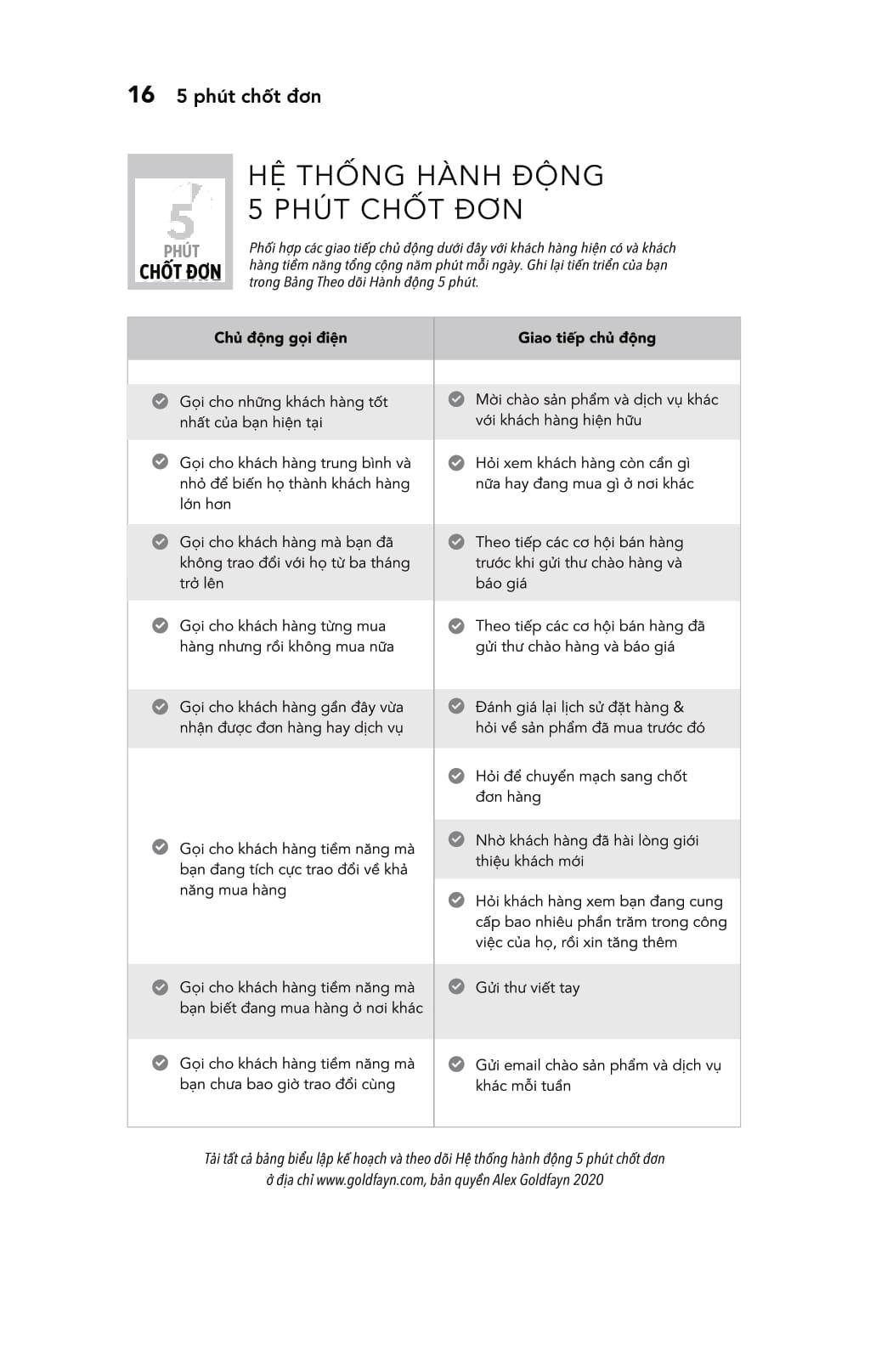 Trong 5 phút chốt đơn, Alex Goldfayn miêu tả 16 tác nghiệp mất từ ba đến ba mươi giây trong ngày để bạn có thể tăng thêm từ 50% đến 100% doanh số của m.ình.