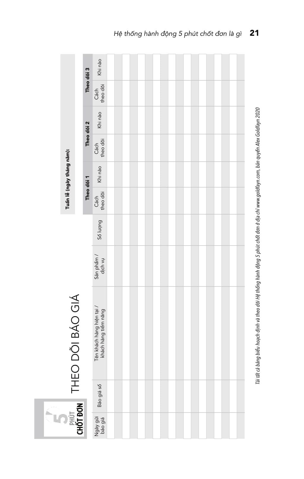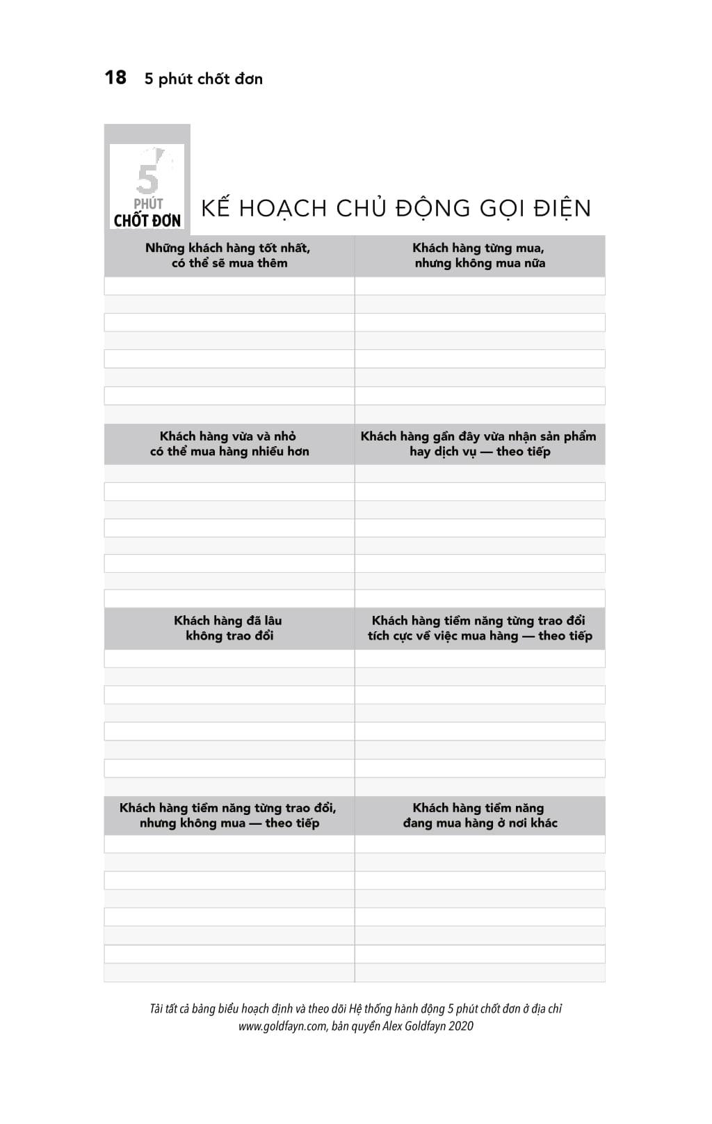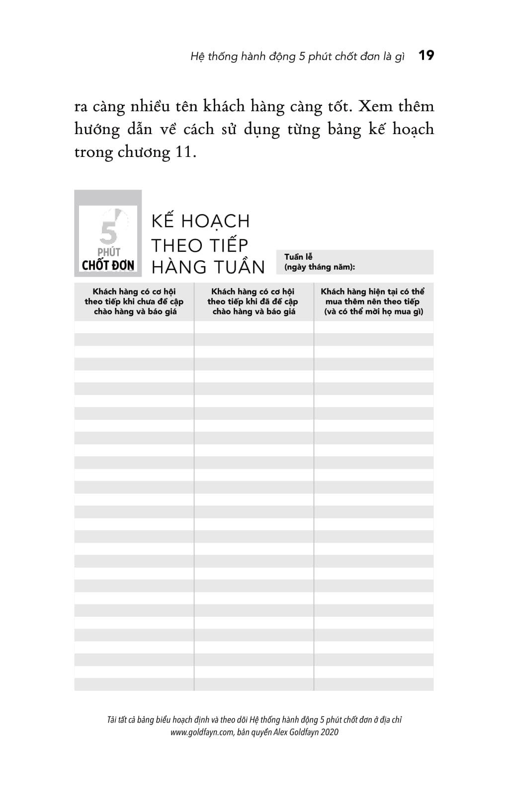 Trong 5 phút chốt đơn, Alex Goldfayn miêu tả 16 tác nghiệp mất từ ba đến ba mươi giây trong ngày để bạn có thể tăng thêm từ 50% đến 100% doanh số của m.ình.