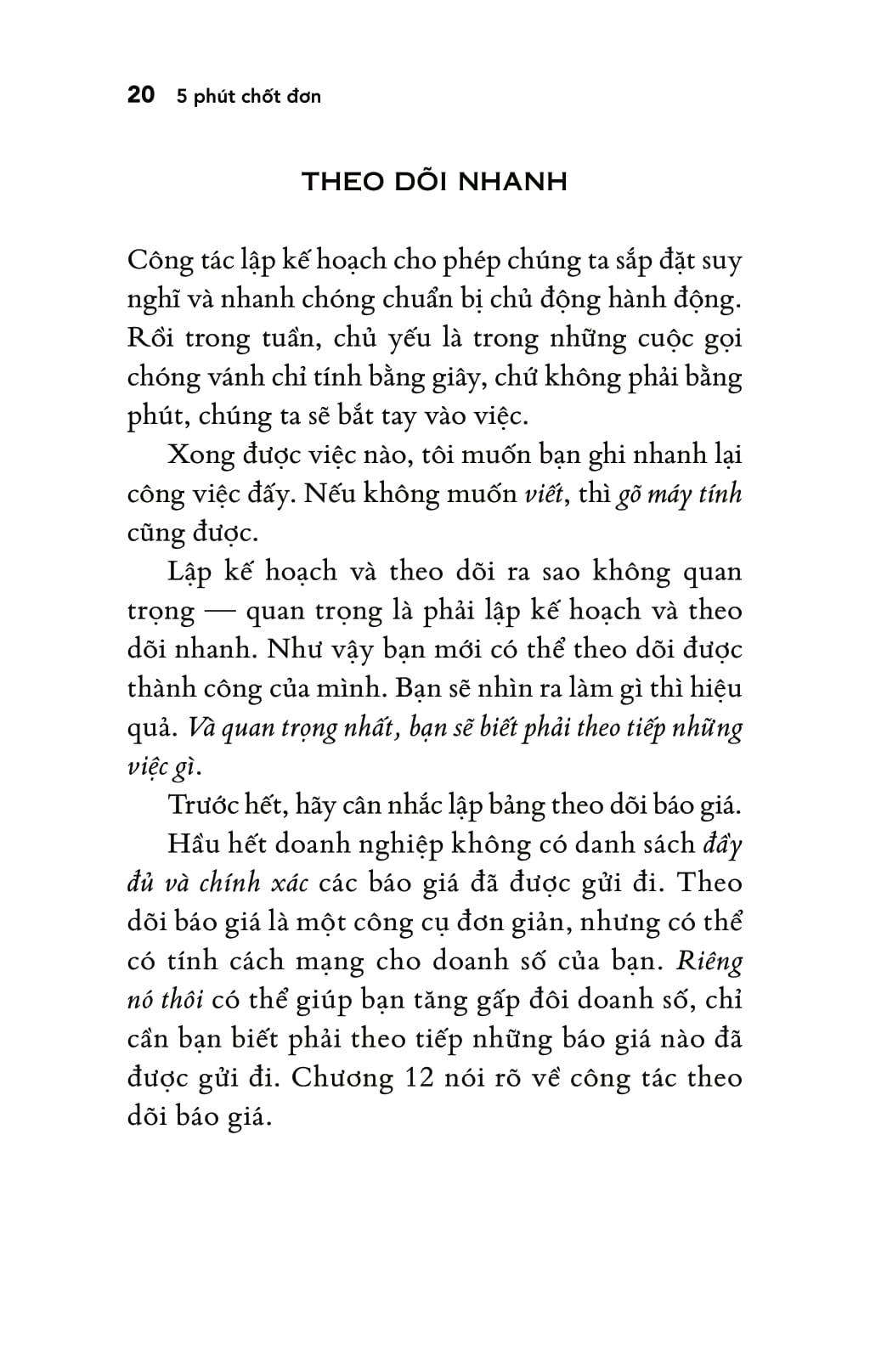 Nói tóm lại, 5 phút chốt đơn là làm cho khách hàng hiện tại và khách hàng tiềm năng thấy chúng ta quan tâm họ nhiều hơn đối thủ cạnh tranh bằng những thông tin liên lạc đơn giản, lặp lại, nhanh như chớp, có giá trị cao và nhất quán.
