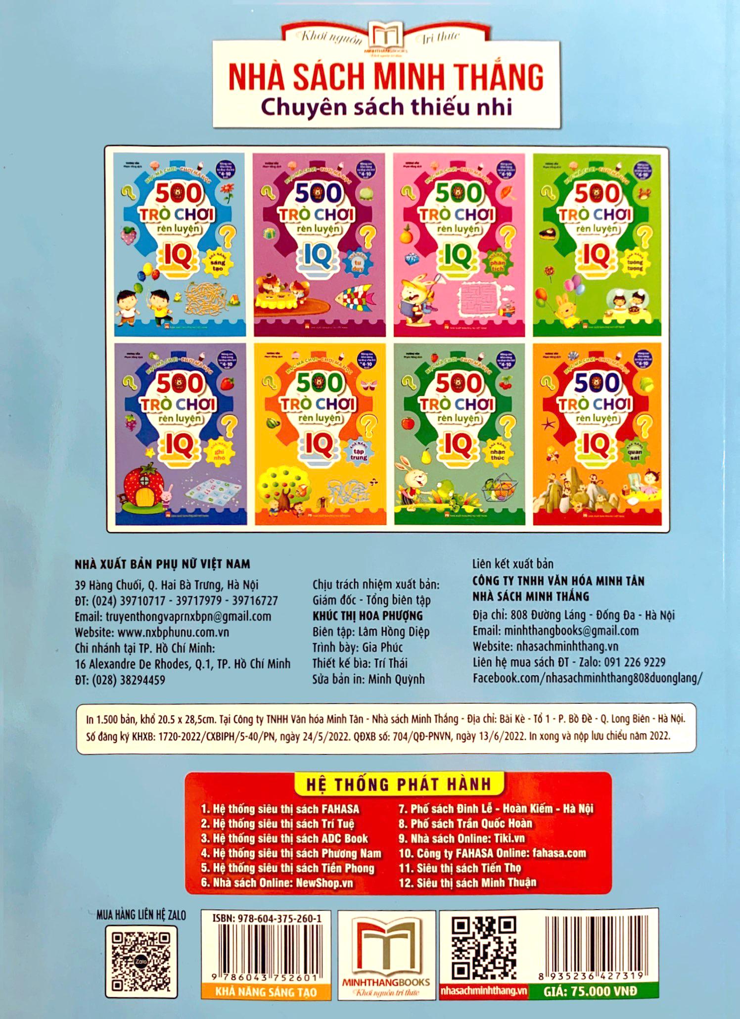 Khả năng tư duy là nhân tố trọng tâm của trí tuệ. Trí tuệ cao hay thấp, chủ yếu được phản ánh thông qua khả năng tư duy. Vậy, rốt cuộc tư duy là gì? Việc rèn luyện tư duy có gì tốt cho trẻ? Việc phát triển đầy đủ khả năng tư duy, nâng cao năng lực học tập có làm cho trẻ tiến bước đến những mục tiêu cao hơn không? Tất cả sẽ được giải đáp trong bộ sách “500 trò chơi rèn luyện IQ (4-10 tuổi)” được viết trên cơ sở lý luận khoa học này. Toàn bộ các bài luyện tập trong sách đều rất thú vị giống như các trò chơi nhỏ. Và thực tế thì, chơi trò chơi chính là hình thức hoạt động cơ bản về tính hư cấu, tượng trưng, hình tượng rất phù hợp với đặc điểm tư duy của trẻ nhỏ trước khi đi học. Giúp trẻ phát triển đầy đủ trên các phương diện như: tư duy ngôn ngữ, tư duy sáng tạo, tư duy không gian, tư duy cũng như không ngừng thách thức bản thân trẻ, tiến bước đến những mục tiêu cao hơn nữa, tạo ra ảnh hưởng quan trọng đến cả cuộc đời của trẻ