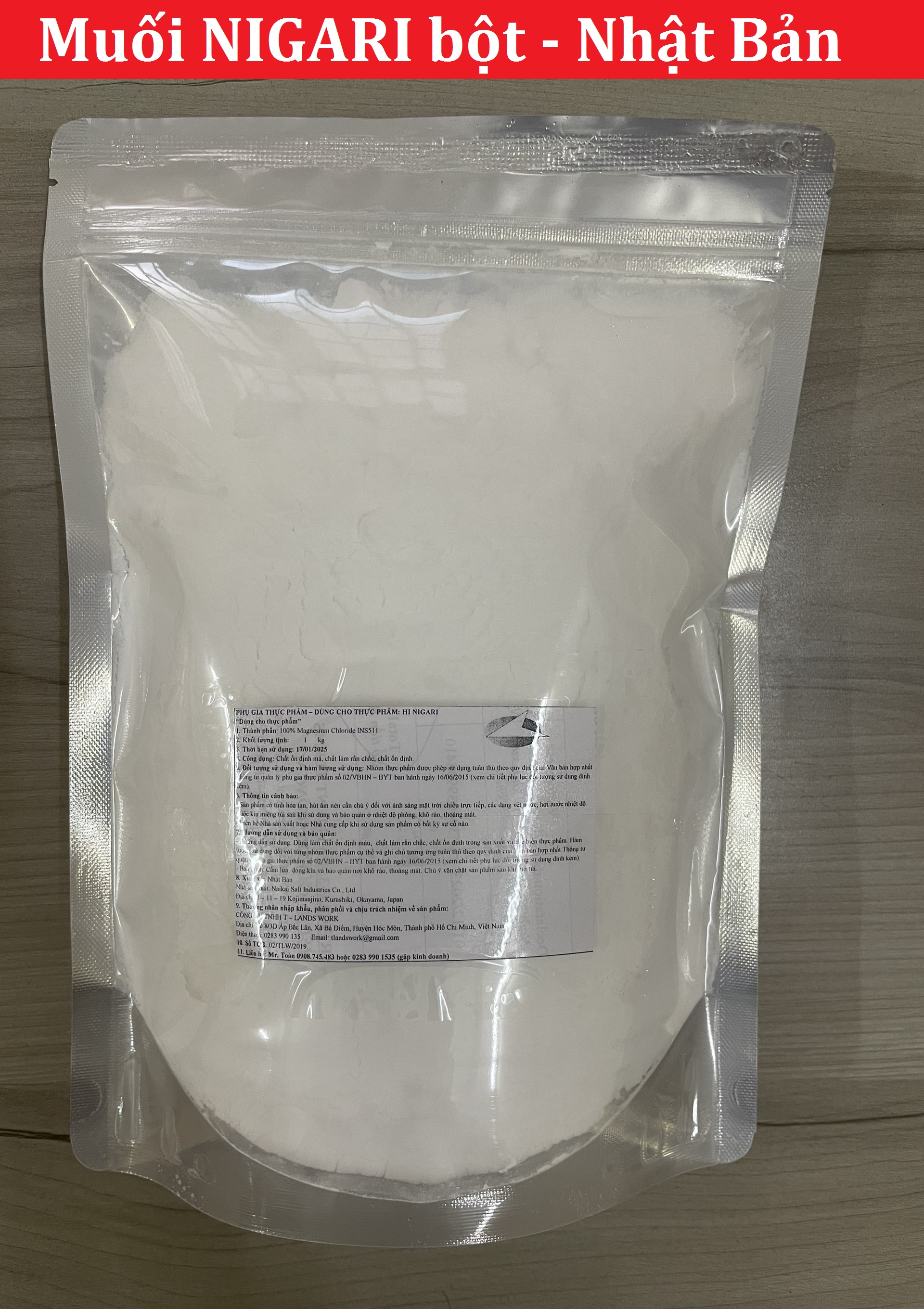 Thông tin về sản phẩmTên thường gọi:Muối Nigari, muối Nhật, muối Nigari bột, muối làm đậu hũTên khoa học: MAGNESIUM CHLORIDE HEXAHYDRATEThành phần: 100% Magnesi clorid (INS 511)Thành p...