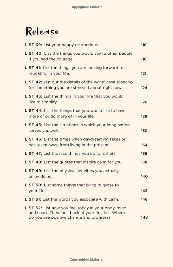 Develop peace of mind and serenity through the calming practice of list-making. Create 52 lists, one for each week of the year, in this lovely undated hardback journal, and along the way, develop a personalized tool kit at the back of the book as a quick reference with strategies to turn to for relief. Includes 52 listing prompts divided into 4 sections: Be Present, Look Back, Move Forward, and Release, plus tips and strategies for mindfulness and relaxation, thought-provoking quotes, short inspiring essays, soothing photography and illustrations, metallic-foil accents, and a ribbon. Those suffering from anxiety, tension, and burnout will find the journal particularly helpful, although anyone can benefit.