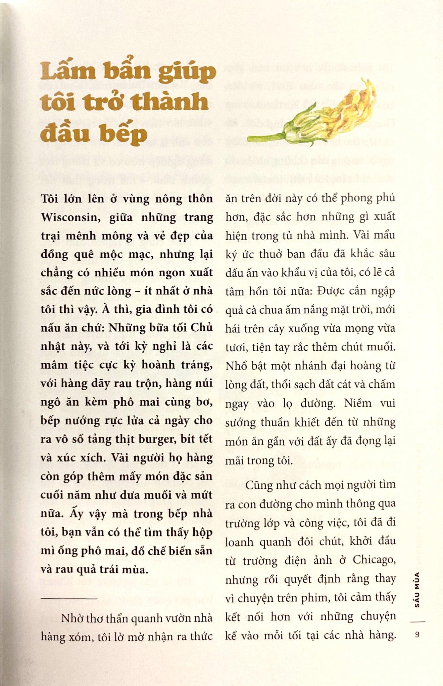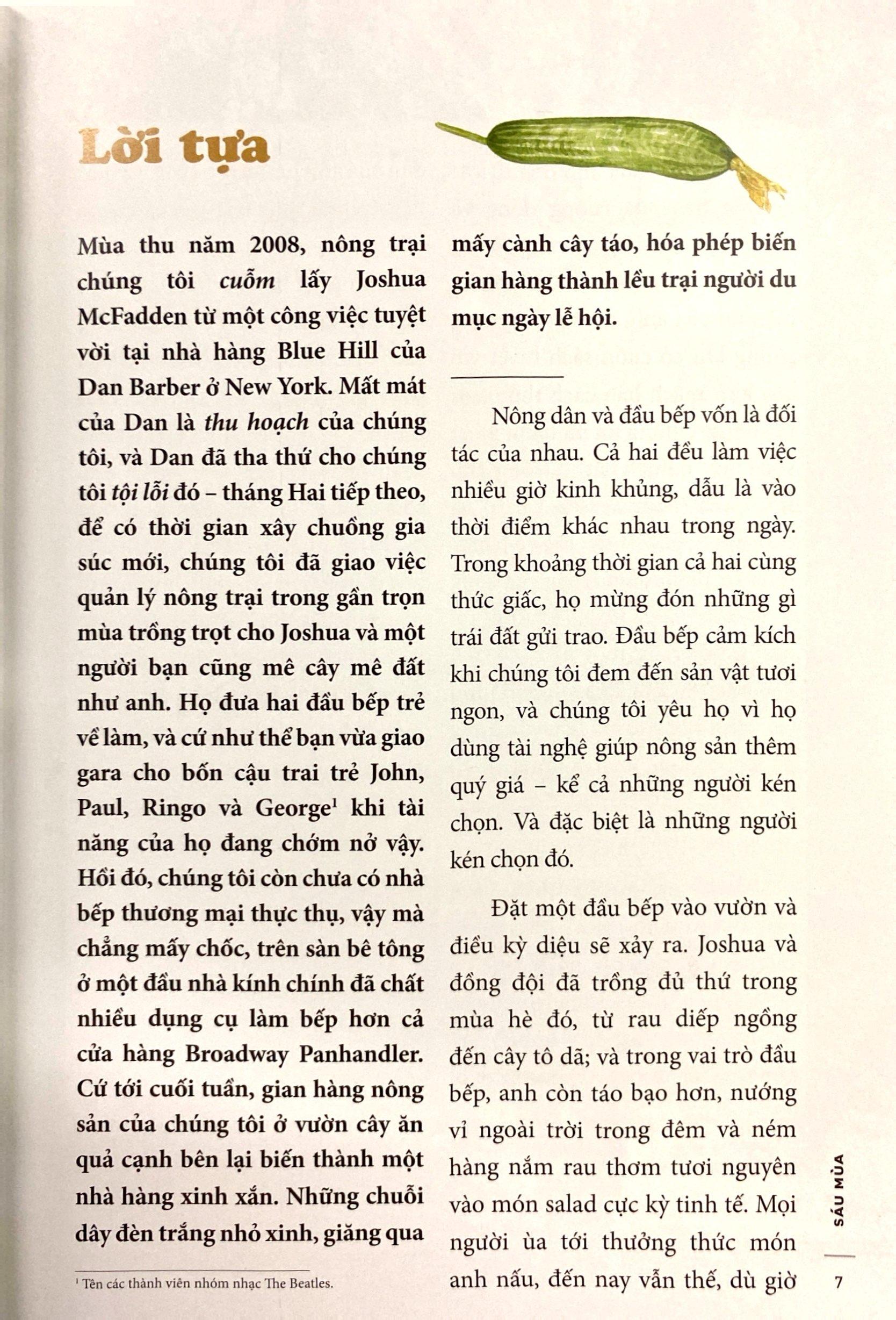 Từ căn bếp của nhà hàng nổi tiếng Blue Hill, Joshua McFadden đã tới “nghịch đất” ở Nông Trại Bốn Mùa, học cách gieo trồng, thu hoạch và chế biến thức ăn theo mùa tươi ngon thấm đẫm vị của đất trời. “Nhưng theo mùa là theo thế nào? Xuân, Hạ, Thu, Đông không đủ để thể hiện những gì thực sự diễn ra ngoài ruộng ngoài vườn, thế nên tôi phân chia cuốn sách thành 6 MÙA, thay vì bốn mùa truyền thống. Trong cuốn sách này, mùa hè được chia làm ba phần, vì mùa hè là mùa năng động, cứ cách vài tuần là cách đợt rau củ mới tới tấp đổ về, gần như một vụ mùa nhỏ.”