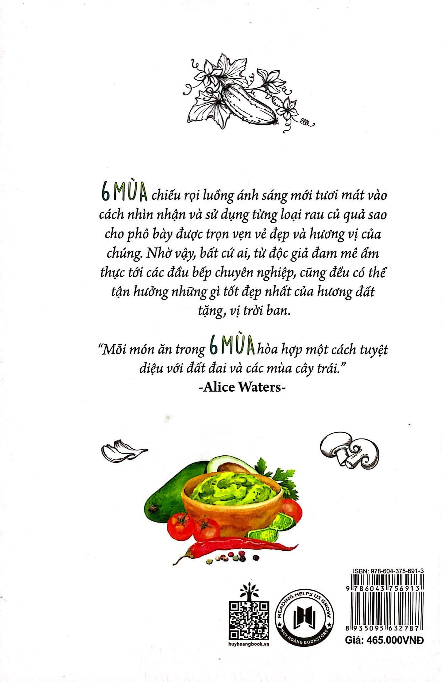 Không chỉ là những công thức đơn điệu, 6 MÙA khuyến khích và hướng dẫn chúng ta, những độc giả bận rộn, cách chế biến thực ăn thịnh soạn, chất lượng mà chẳng hề cầu kỳ. Cuốn sách chiếu rọi luồng ánh sáng mới tươi mát vào cách nhìn nhận và sử dụng từng loại rau củ quả sao cho phô bày được trọn vẹn vẻ đẹp và hương vị của chúng. Nhờ vậy, bất cứ ai, từ độc giả đam mê ẩm thực tới các đầu bếp chuyên nghiệp, cũng có thể tận hưởng những gì tốt đẹp nhất của hương đất tặng, vị trời ban.