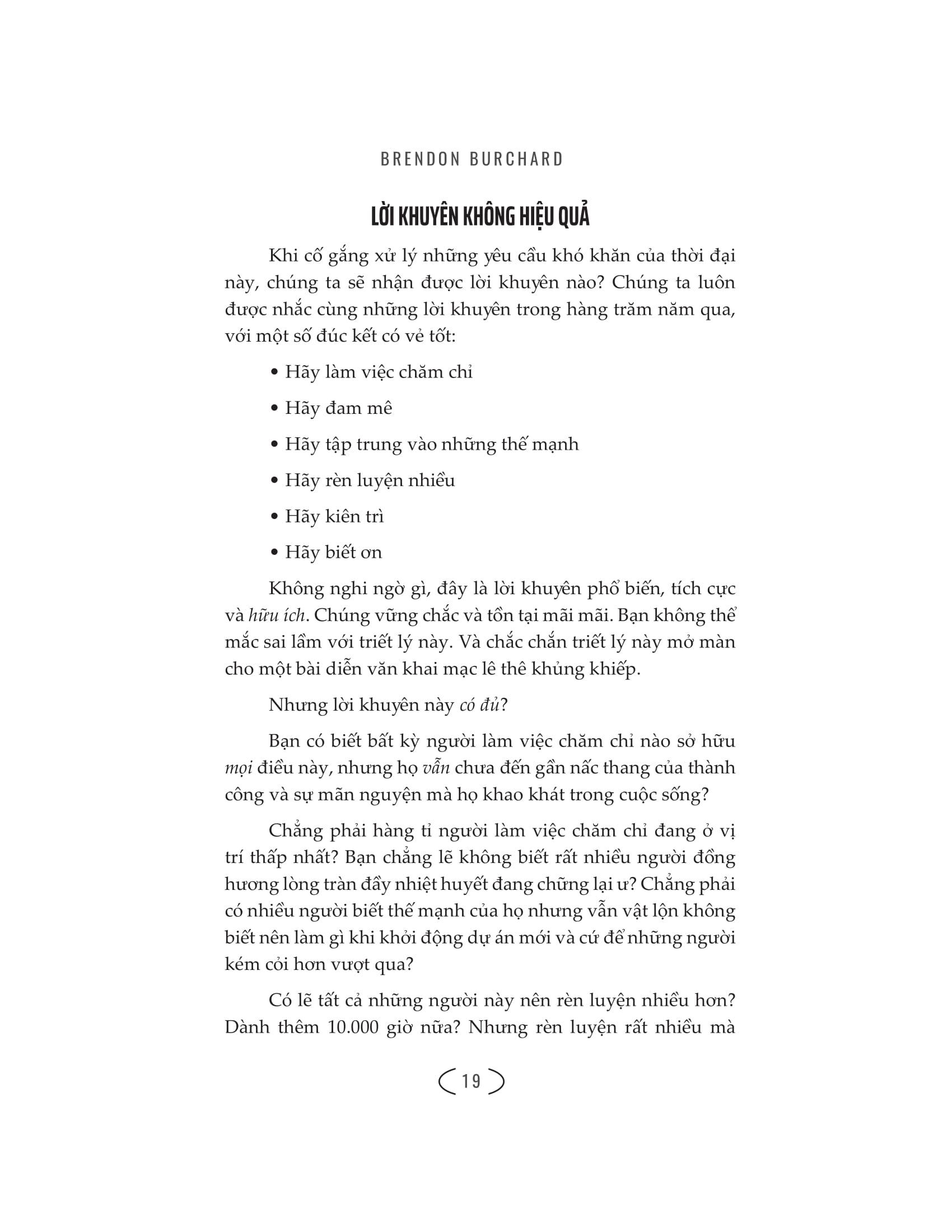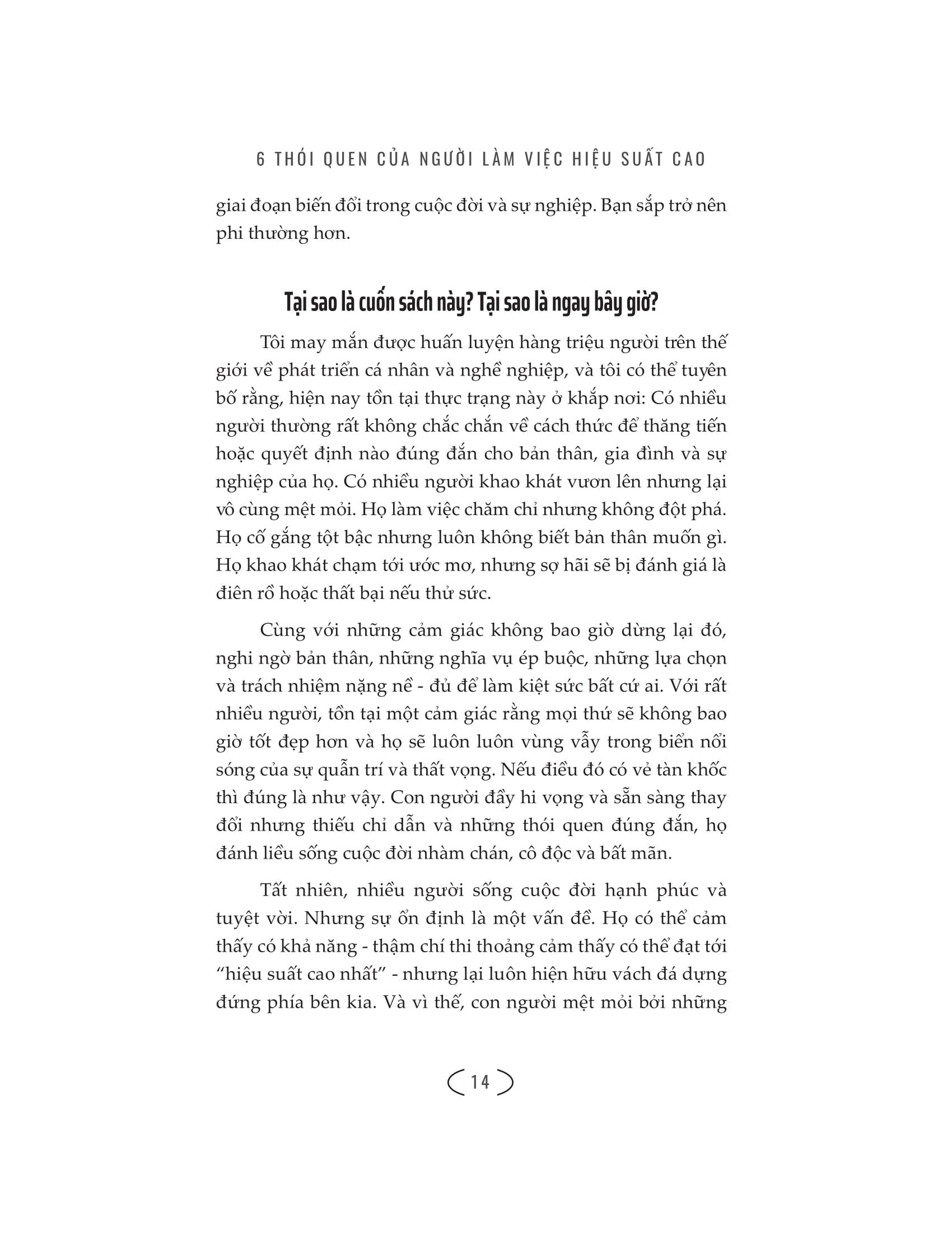 Tất cả chúng ta đều muốn có hiệu suất cao trong mọi lĩnh vực cuộc sống, từ học tập, làm việc, đến mở rộng mối quan hệ hay xử lý các vấn đề cá nhân. Nhưng ta phải làm những gì, phải hình thành những thói quen nào để đạt được thành công lâu dài và hạnh phúc bất kể tuổi tác, nghề nghiệp, ưu điểm hay tính cách của ta? Brendon Burchard – một trong những nhà huấn luyện uy tín nhất thế giới hiện nay về vấn đề phát triển bản thân đã chỉ ra 6 thói quen cần có để tối ưu hiệu suất làm việc. Đó là: