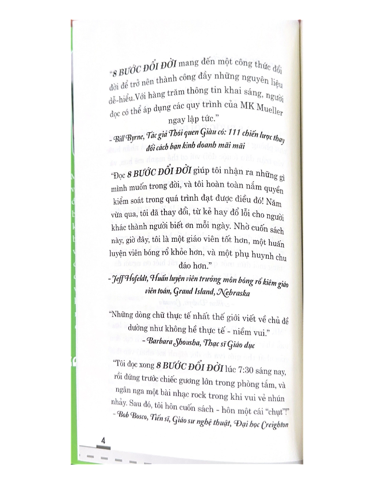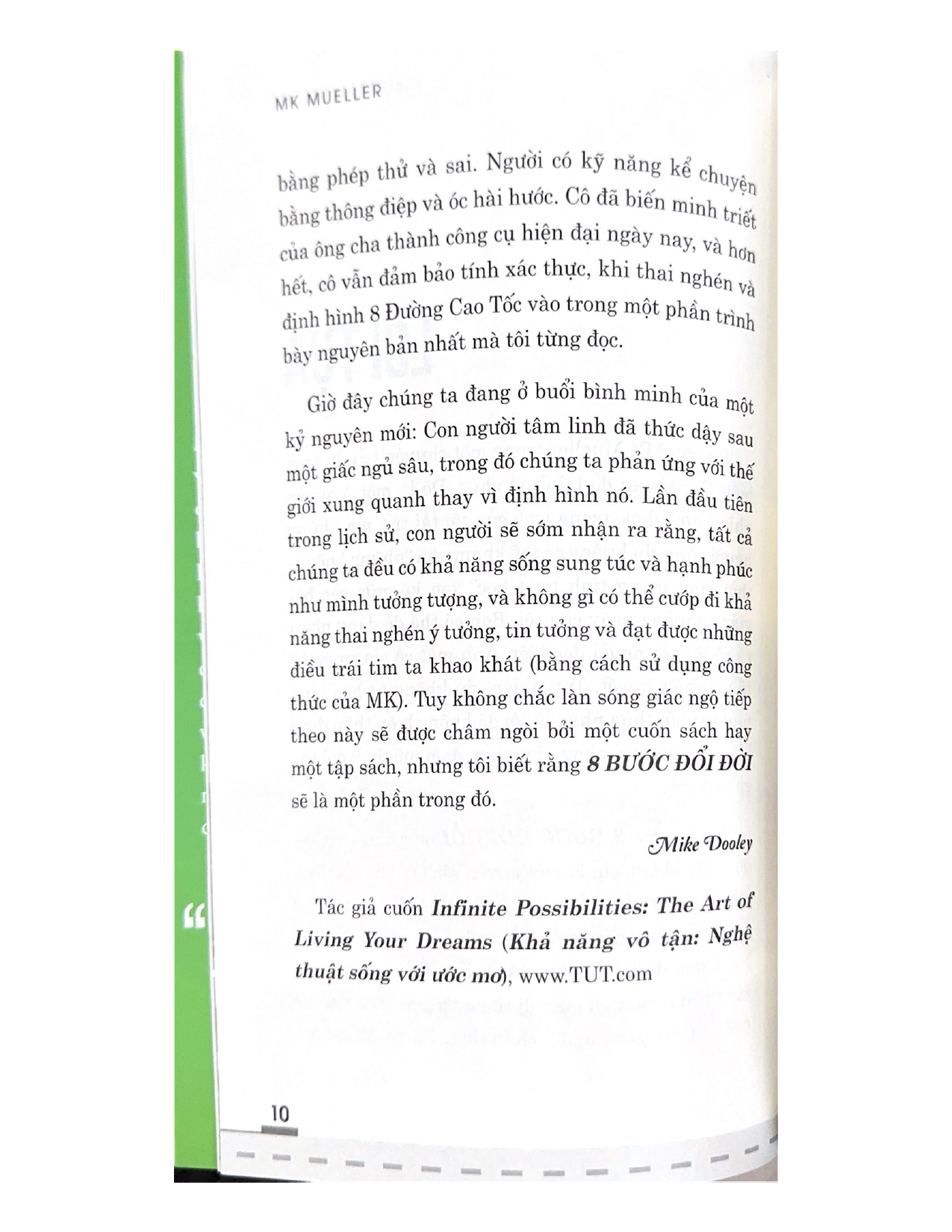 - Giới thiệu 8 Bước Đổi Đời - 8 To Great Trong 8 BƯỚC ĐỔI ĐỜI, tác giả MK Mueller trình bày 8 bước cơ bản mà những người hạnh phúc, khỏe mạnh và thành công nhất đều áp dụng. Sách dựa trên quá trình 8 bước giúp mọi người theo đuổi ước mơ - dù cho đó là giảm cân và giảm đường mà không lên cơn thèm, tìm được công việc mơ ước, tận hưởng mối quan hệ như mơ, nâng cao thành tích thể dục thể thao trong vài ngày, thoát nợ, hoặc giành được học bổng vào đại học. Cách tiếp cận 8 bước giúp kết nối thân-tâm-trí của tác giả được hình thành dựa trên những nguyên tắc sống mãi với thời gian như chịu trách nhiệm hoàn toàn, dám mạo hiểm, cảm nhận mọi cảm xúc và tha thứ cho quá khứ. Đây là cuốn sách chạm đến trái tim của người đọc và giúp thay đổi mỗi người từ trong ra ngoài.