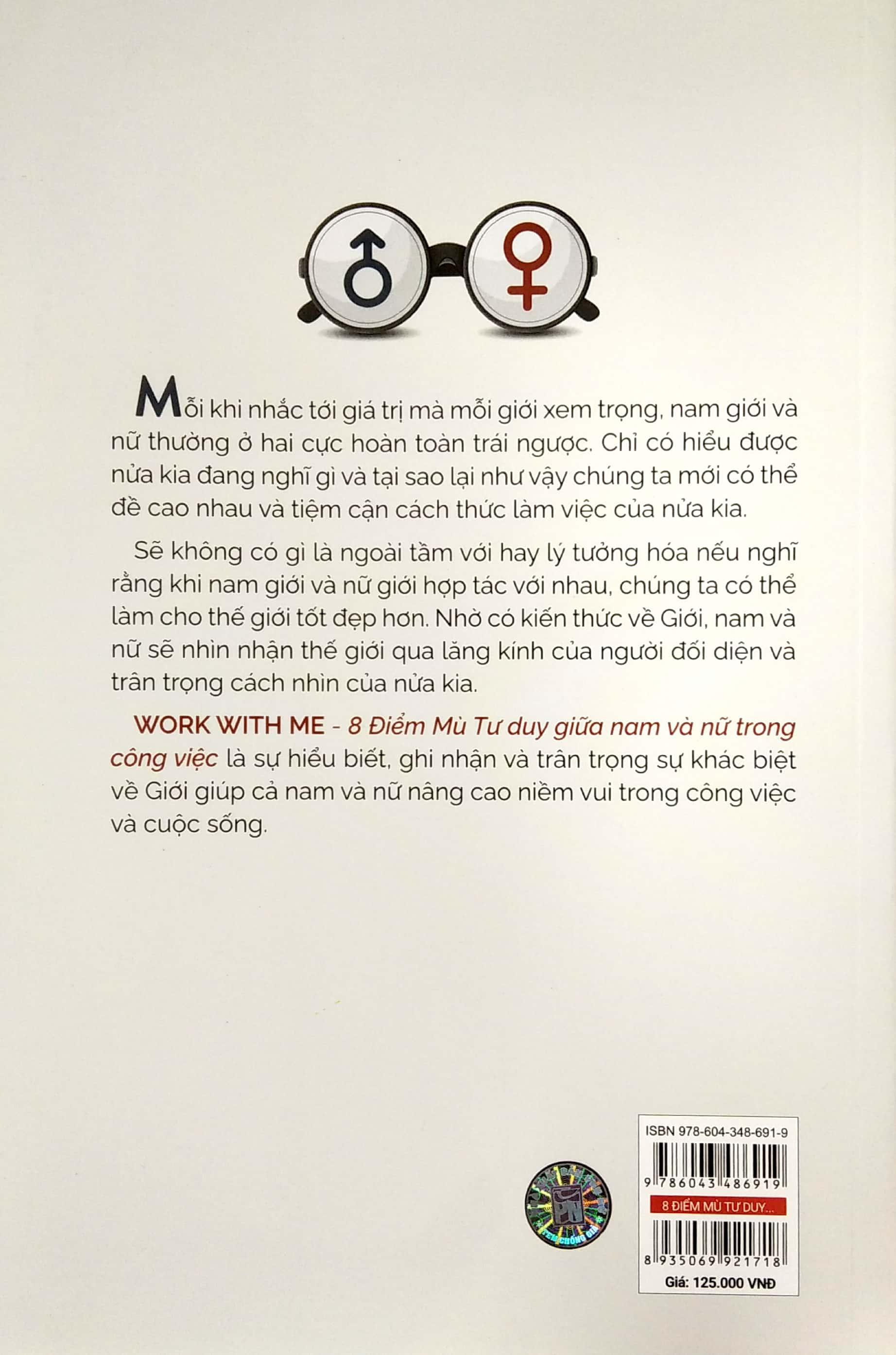 WORK WITH ME - 8 Điểm Mù Tư duy giữa nam và nữ trong công việc là cuốn sách khám phá về Giới, một chủ đề khá mới trong xã hội hiện đại. Từ lâu, trong các mối quan hệ giữa đàn ông và phụ nữ luôn có những điểm khác biệt dẫn đến những sự phân công lao động khác nhau cũng như những “định kiến Giới” khiến mỗi giới không phát huy hết được những tiềm năng và thế mạnh của bản thân mình. Từ đó tạo nên những khoảng cách và quan niệm bất bình đẳng, đặc biệt trong công việc. Nhiều người cảm thấy bế tắc, chán chường, muốn bỏ cuộc vì họ không thể hòa hợp được với người khác giới trong công việc.