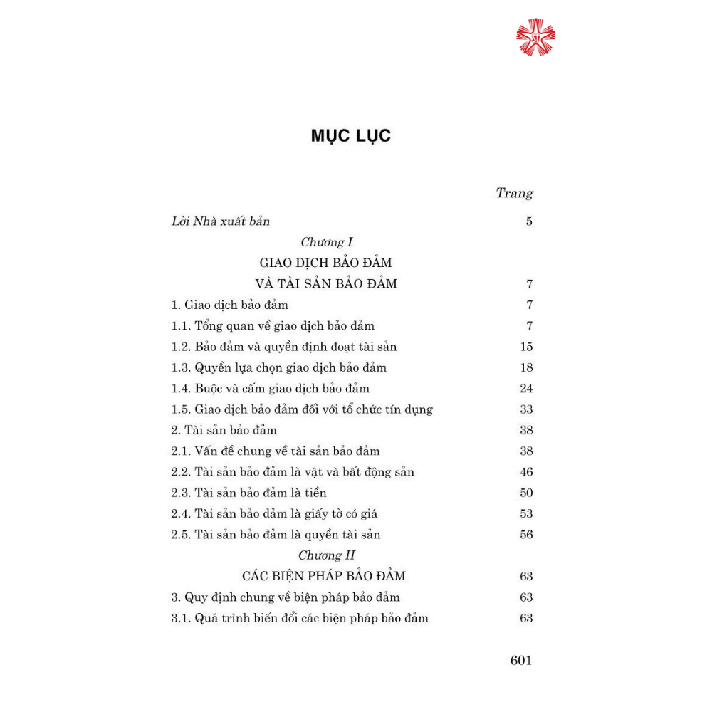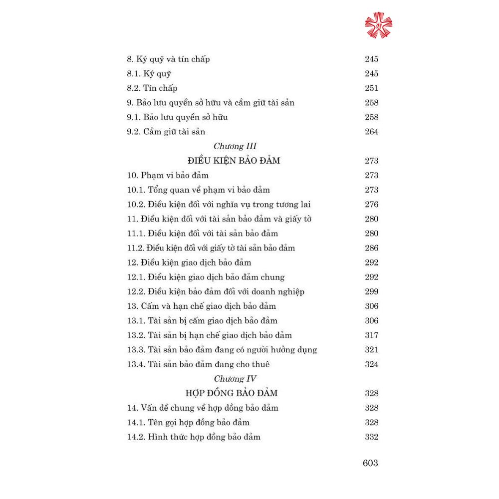 Cuốn sách gồm 101 tiểu mục, 24 mục, 6 chương (Giao dịch bảo đảm và tài sản bảo đảm; Các biện pháp bảo đảm; Điều kiện bảo đảm; Hợp đồng bảo đảm; Thủ tục và hiệu lực bảo đảm; Xử lý tài sản bảo đảm) được trình bày một cách hệ thống, đầy đủ, rõ ràng về mọi vấn đề, từ lý giải về các quy định pháp luật và liên hệ thực tế cho đến thiết kế các mẫu hợp đồng bảo đảm.