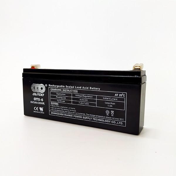 Ắc quy lưu điện OUTDO OT5-6 Nhập khẩu: Trung Quốc Hãng sản xuất : Zhangzhou Huawei Power Supply Technology Co.,Ltd. Đặc tính : khô, kín khí Công suất : 6V - 5AH Kích thước: Kích