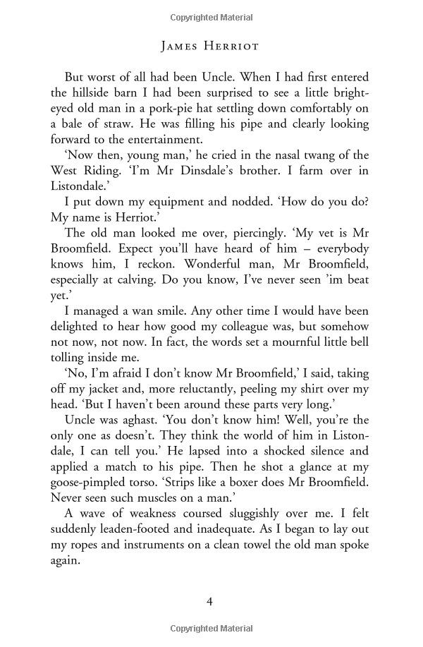 Fresh out of Glasgow Veterinary College, to the young James Herriot 1930s Yorkshire seems to offer an idyllic pocket of rural life in a rapidly changing world. But from his erratic new colleagues, brothers Siegfried and Tristan Farnon, to incomprehensible farmers, herds of semi-feral cattle, a pig called Nugent and an overweight Pekingese called Tricki Woo, James finds he is on a learning curve as steep as the hills around him. And when he meets Helen, the beautiful daughter of a local farmer, all the training and experience in the world can’t help him . . .