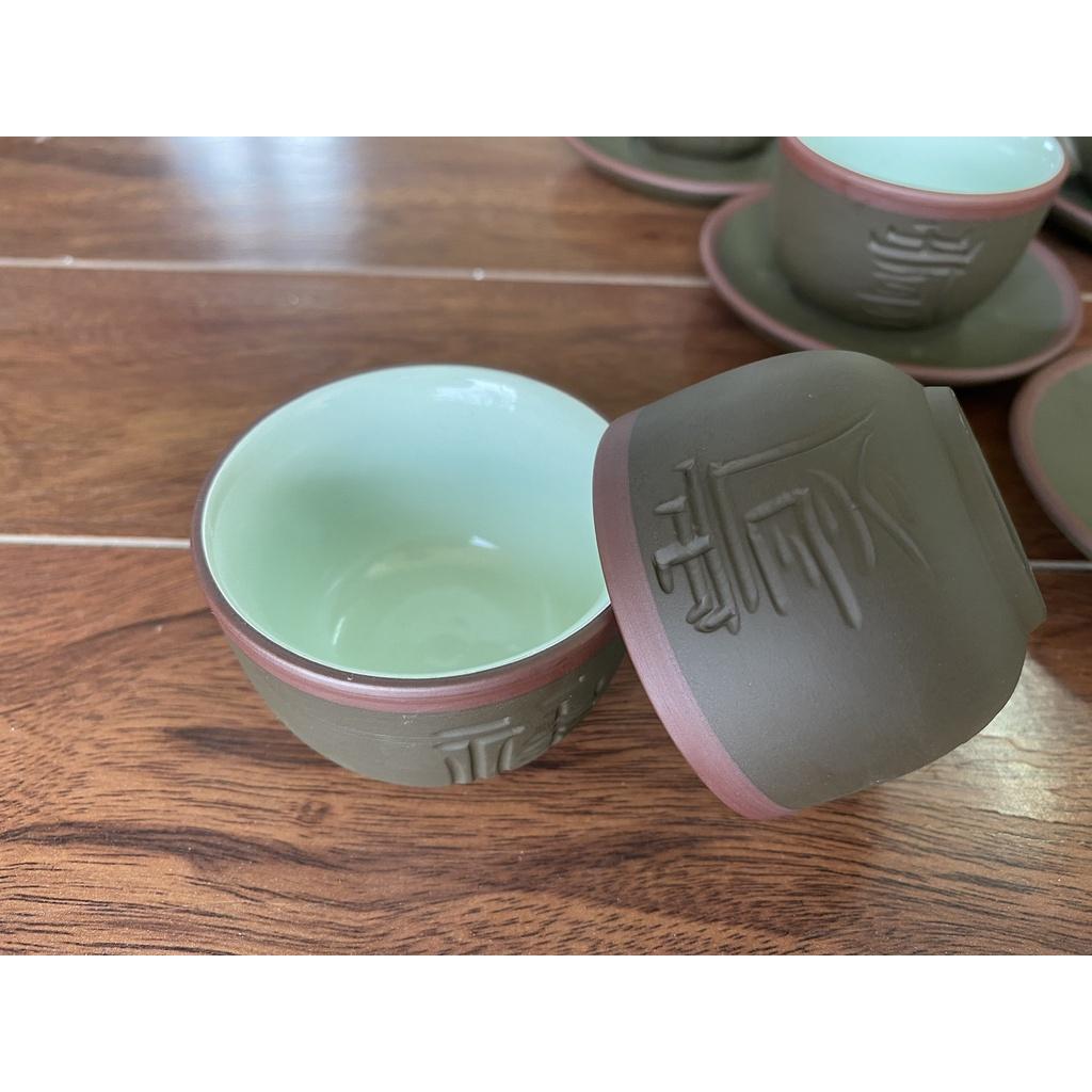 Ấm chén men xanh rêu đậm khắc hoạ tiết sen Gốm sứ Bát Tràng Bọc đồng cao cấp ĐẸP sang trọng và cuốn hút 1 ấm 6 chén 7 đĩa kê giá 1000k Phụ kiện