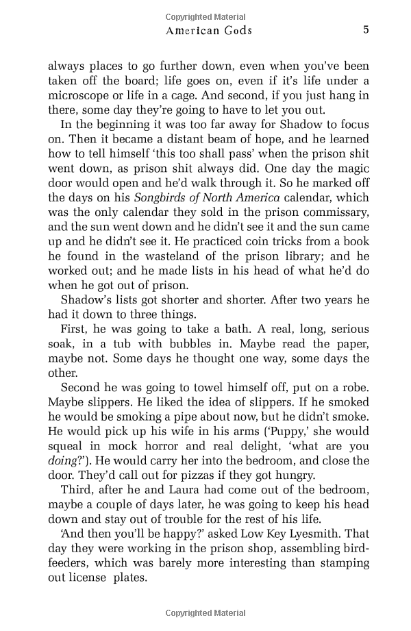 First published in 2001, American Gods became an instant classic, lauded for its brilliant synthesis of “mystery, satire, sex, horror, and poetic prose” (Washington Post) and as a modern phantasmagoria that “distills the essence of America” (Seattle Post-Intelligencer). It is the story of Shadow—released from prison just days after his wife and best friend are killed in an accident—who gets recruited to be bodyguard, driver, and errand boy for the enigmatic trickster, Mr. Wednesday. So begins Shadow’s dark and strange road trip, one that introduces him to a host of eccentric characters whose fates are mysteriously intertwined with his own. For, beneath the placid surface of everyday life, a storm is brewing—an epic war for the very soul of America—and Shadow is standing squarely in its path.