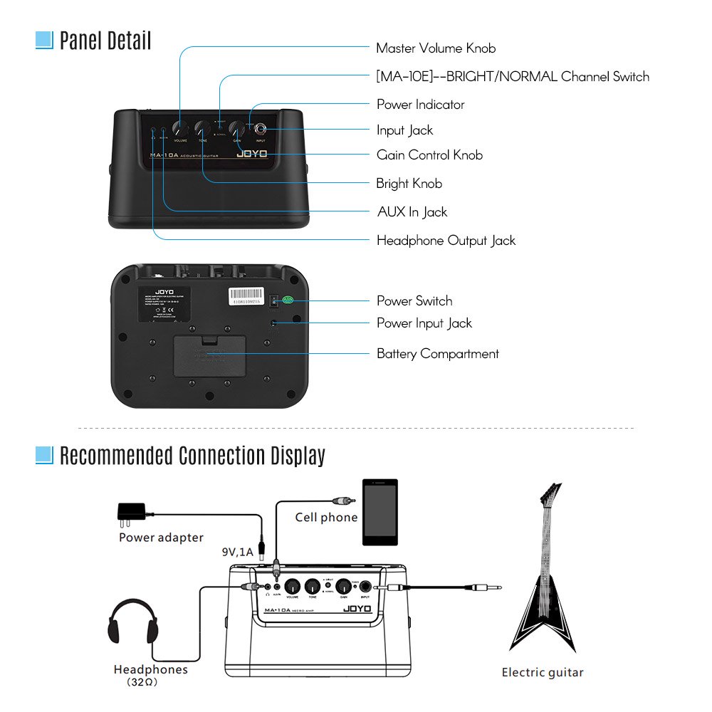 - Nguồn điện: Bộ đổi nguồn 9V 1200mA hoặc pin 6 * AA Lưu ý:Bộ sạc BESTON không có chế độ tự ngắt. Đèn vẫn hiển thị khi được sạc đầy, tuy nhiên, bộ sạc BESTON sẽ tự điều chỉnh để hạn chế dòng điện vào pin nhằm giữ tuổi thọ pin lâu dài mà không bị chai pin.Bạn nên ngắt điện hoặc tháo pin ra khỏi bộ sạc để tăng cao tuổi thọ của pin. Amplifier Joyo MA-10E cho đàn guitar Electric