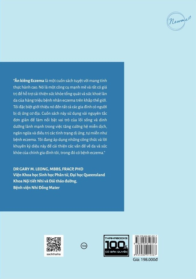 Ăn Kiêng Eczema (Bệnh Chàm, Viêm Da Cơ Địa) - Karen Fischer - Hanah Nguyen dịch - (bìa mềm) - Giá bìa: 198.000đ Ăn kiêng Eczema là gì? Thoạt nhìn, Ăn kiêng Eczema có vẻ tương tự như một chế độ ăn kiêng thông thường, nhưng thực tế chúng lại khác nhau ở nhiều điểm. Ăn kiêng Eczema được thiết kế dành riêng cho những người bị bệnh eczema. Trong khi ăn kiêng, bạn cần tạm thời loại bỏ những thực phẩm gây kích ứng ra khỏi bữa ăn và thay bằng những thực phẩm ‘an toàn cho bệnh eczema’ để giúp tăng cường sức khỏe. Ăn kiêng Eczema vẫn cực kỳ bổ dưỡng và khi bạn (hoặc con bạn) khỏi bệnh, bạn có thể đa dạng hóa thức ăn và thưởng thức hầu hết – nếu không muốn nói là tất cả – các loại thực phẩm mà không bị bệnh tái phát (nếu bạn bị dị ứng nghiêm trọng, hãy tiếp tục tránh các loại thực phẩm gây dị ứng cho đến khi được bác sĩ cho phép). Sau khi chức năng bảo vệ của da được phục hồi, mạt bụi sẽ không còn là vấn đề nữa và bạn có thể tiếp tục các hoạt động bình thường như bơi lội và chơi với thú cưng. Trong cuốn sách “Ăn kiêng Eczema” của tác giả Karen Fischer sẽ bao gồm ba phần. Phần 1 chứa tất cả thông tin về da cũng như rất nhiều lời khuyên về cách kiểm soát và khắc phục bệnh eczema. Phần 2 có những thông tin hữu ích khác ngoài chế độ ăn chẳng hạn như công thức pha nước tắm, kem dưỡng ẩm hay cách trị ngứa nhanh chóng mà bạn có thể tham khảo bất cứ lúc nào nếu cần. Và phần 3 bao gồm các công thức nấu ăn an toàn với eczema, hướng dẫn mua sắm, các biểu đồ thực phẩm và thực đơn cho từng nhóm tuổi cụ thể, từ trẻ sơ sinh đến người lớn, cũng như hướng dẫn về thức ăn tiệc tùng cho những dịp đặc biệt. Xin lưu ý rằng bạn sẽ cần điều chỉnh chúng sao cho phù hợp với tình trạng dị ứng, yêu cầu về thể chất và tình trạng bệnh eczema của bản thân mình. Sách cũng có các hướng dẫn riêng dành cho trẻ sơ sinh, trẻ em và người lớn. Tác giả biết rằng khi bị eczema, bạn phải trải qua những cơn đau đớn và ngứa ngáy vô cùng. Và nếu con mình hoặc bạn bè bị bệnh thì bạn cũng khổ sở chẳng kém. Đôi khi những khổ sở đau đớn nhất lại là động lực mạnh mẽ nhất thúc đẩy bạn không ngừng tìm ra các phương pháp điề trị mới hiệu quả hơn và thực sự phù hợp với bản thân. Tác giả Karen hy vọng bạn thích chế độ ăn này và chúc bạn thành công trong nỗ lực chữa bệnh eczema và có một làn da tuyệt đẹp. MỤC LỤC: Giới thiệu Câu chuyện thành công Eczema + chế độ ăn