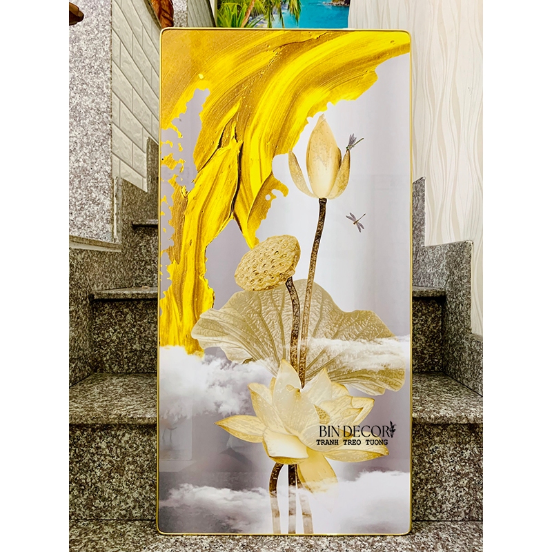 Tranh treo tường tráng gương hiện đại hoa sen vàng