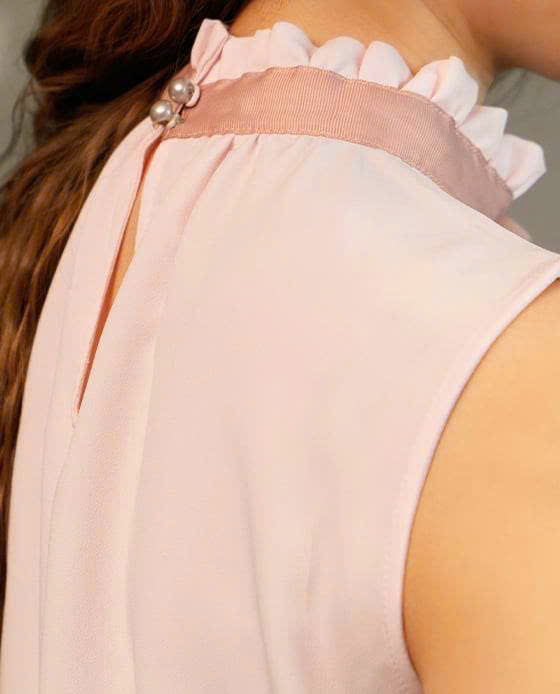 Áo kiểu dáng suông Không tay Cổ cao viền bèo, ruy băng gân viền thắt nơ cổ Cài bằng nút phía sau Chất liệu chính: Polyester Ruy băng gân Polyester Cắt may thủ công tinh