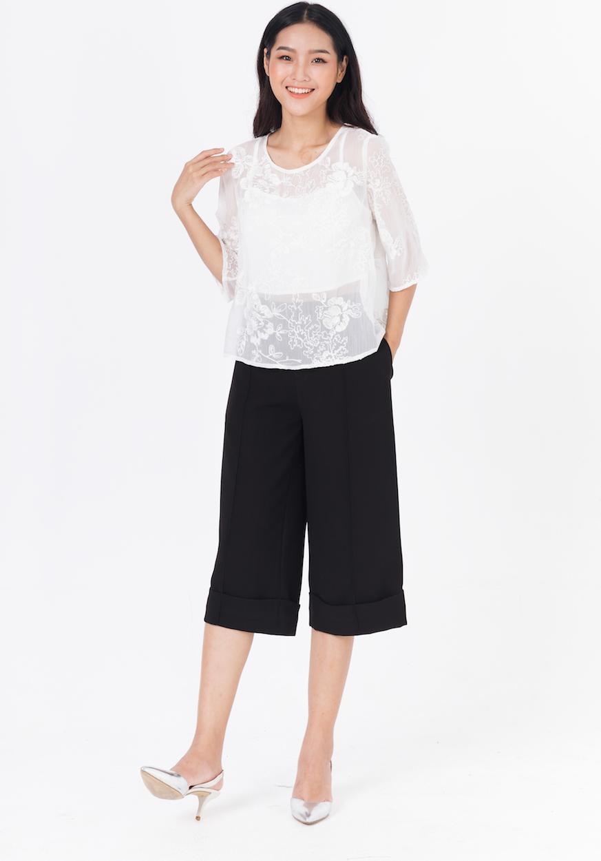 Áo croptop tay lửng vải tơ thêu tinh tế, thanh lịch, trẻ trung. Áo 2 lớp với áo lót trong rời, dáng croptop ngắn quyến rũ. Áo có thể phối với chân váy nữ tính, hoặc phối với quần tây, quần sóc hay quần cullote rộng trẻ trung
