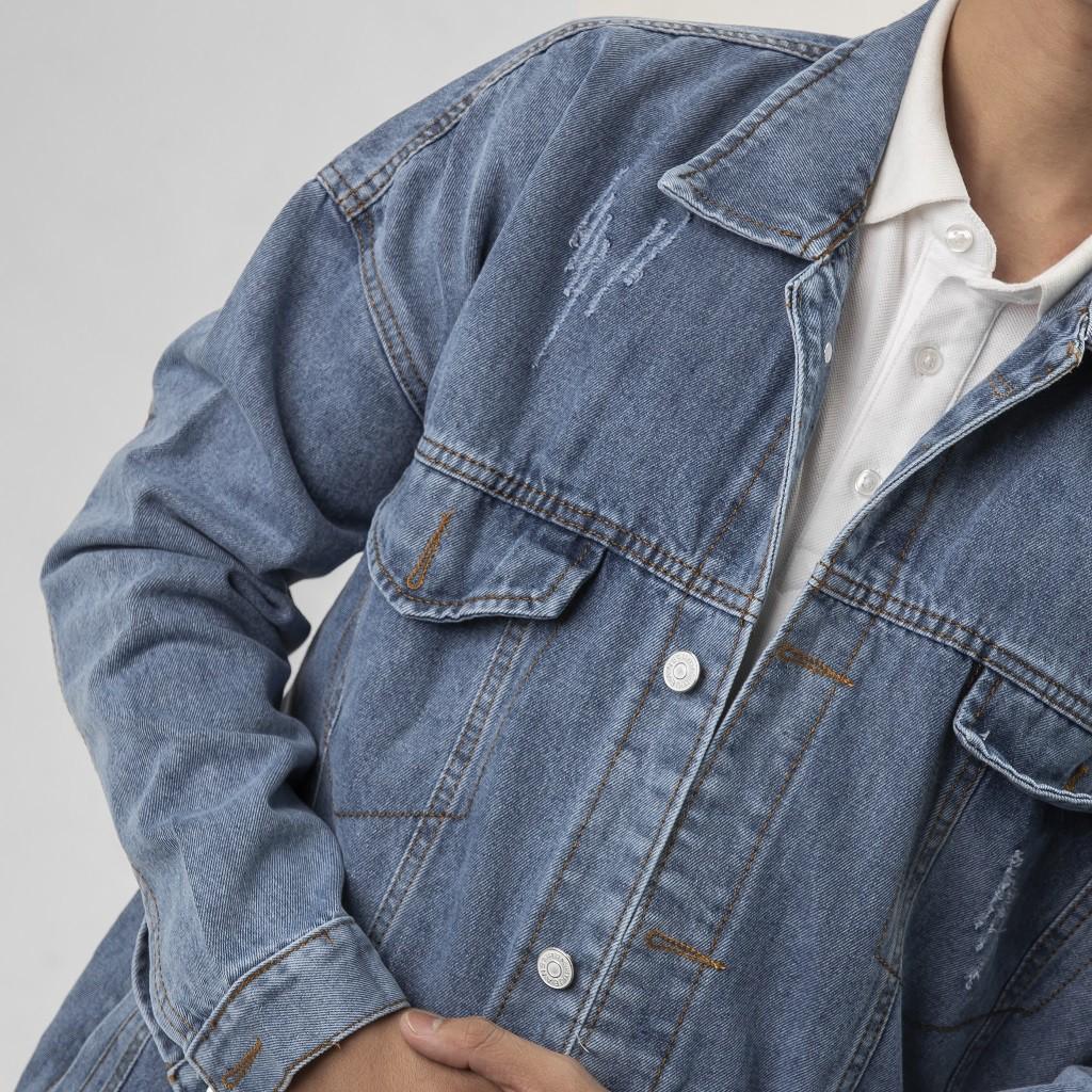 Áo khoác jeans xanh rách Uniex Just One More cực chất Chất Liệu: Vải Jean xịn mặc mát, form đẹp Size : S, M, L, XL, XXl Áo khoác jean form rộng Unisex nam nữ