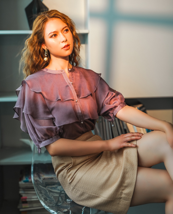 Áo dáng suông, với phần cổ cách điệu được nhún li ngực tạo phom suông rộng trẻ trung. Áo với điểm nhấn là hàng khuy trai 1 bên vài và tay bo kẹp bèo nhí