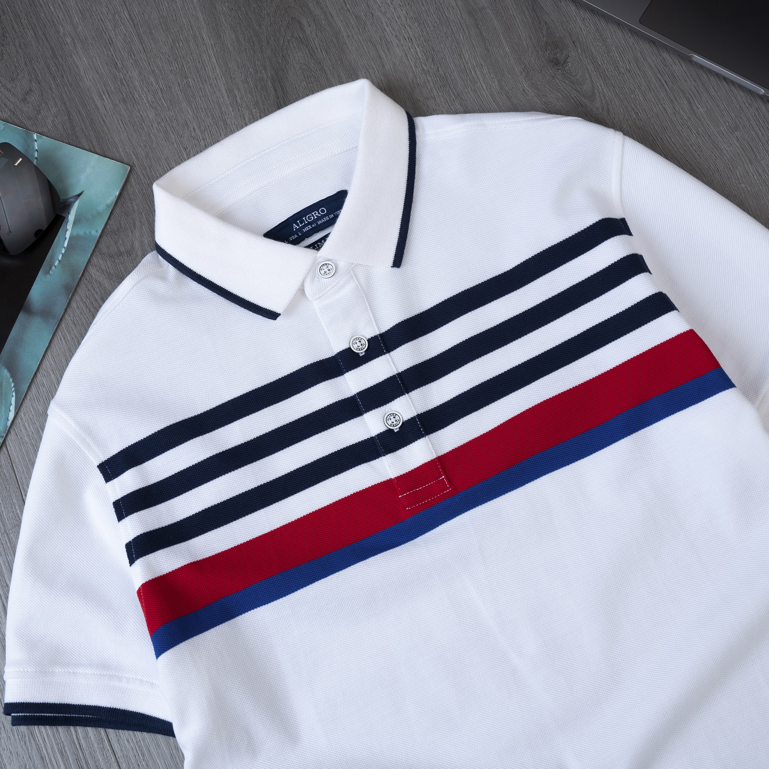 ✨Áo Polo nam ngắn tay trắng kẻ ngang navy-đỏ-xanh ALGPLO126