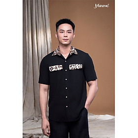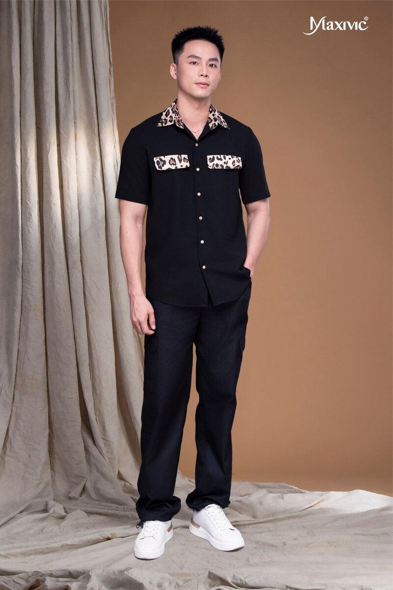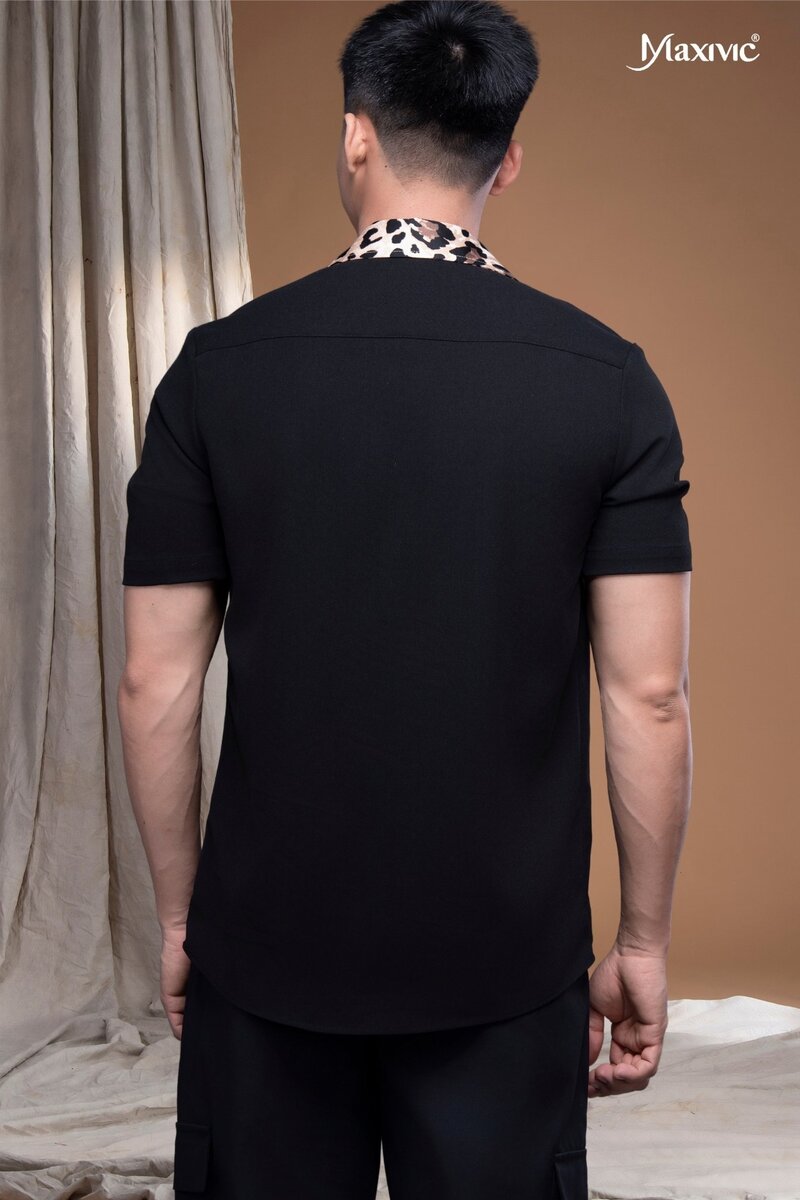 - Áo sơ mi đen tay ngắn, cổ và nắp áo phối hoạ tiết da beo mang lại vẻ ngoài phóng khoáng và trẻ trung cho người mặc