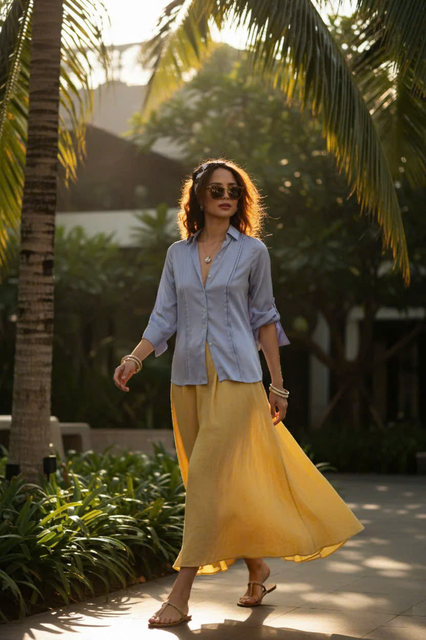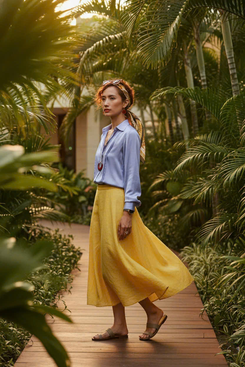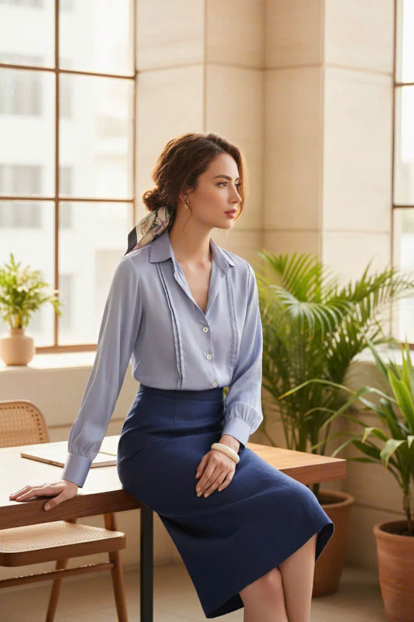 - Chất liệu mềm mại: Chất liệu là điểm nhấn quan trọng nhất. Lụa tổng hợp tạo độ rủ tự nhiên, mềm mại trên da, mang lại cảm giác mát lạnh trong ngày hè và giữ được sự sang trọng, đứng dáng cần thiết cho môi trường làm việc. Ánh sáng vàng của buổi chiều tà càng làm nổi bật độ bóng nhẹ (sheen) của lụa, khiến bạn tỏa sáng một cách tự nhiên.